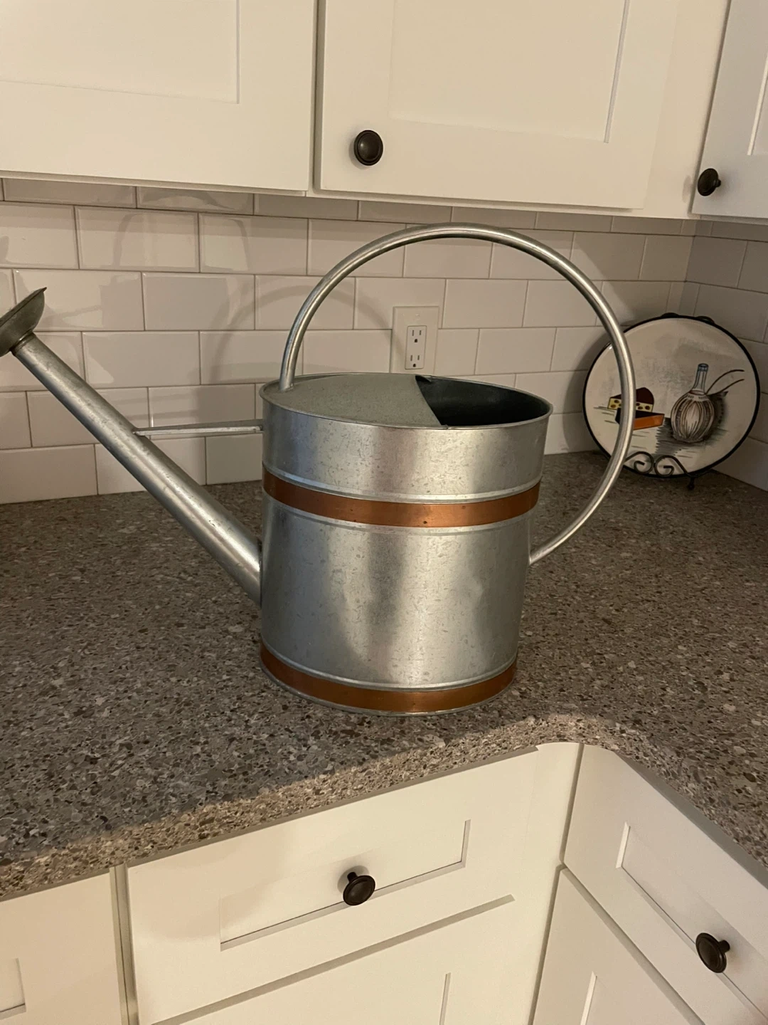 10Selling a cute galvanized metal watering can! It has a copper trim that gives it a nice touch. Used for indoor decor.