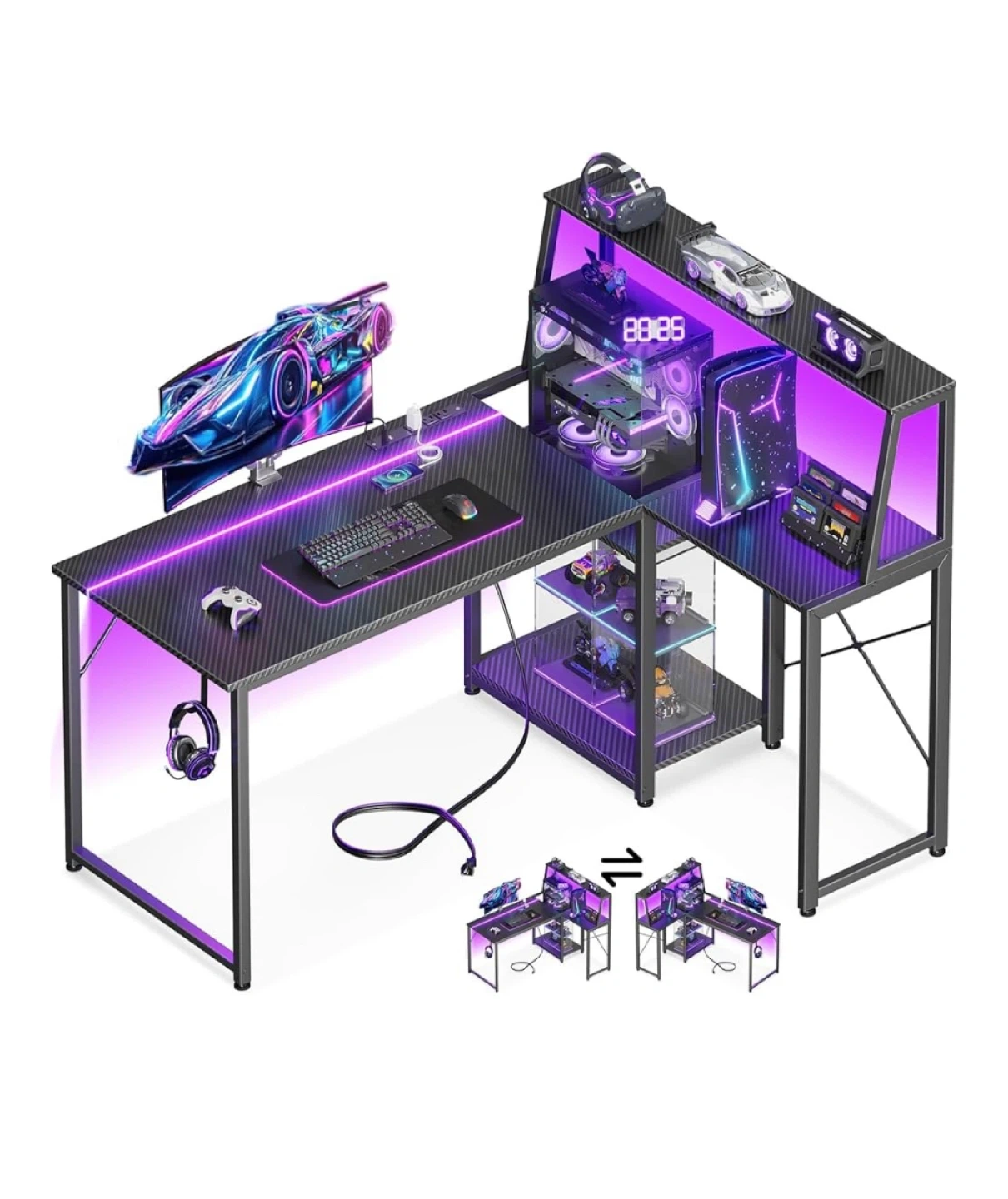 Selling a gaming desk that's perfect for setting up your ultimate gaming station! It features built-in shelves for displaying your favorite collectibles or storing your gaming accessories. The desk has a sleek design with a carbon fiber texture and cool LED lighting to enhance your gaming experience. It's sturdy and provides ample space for your monitor, keyboard, mouse, and other peripherals