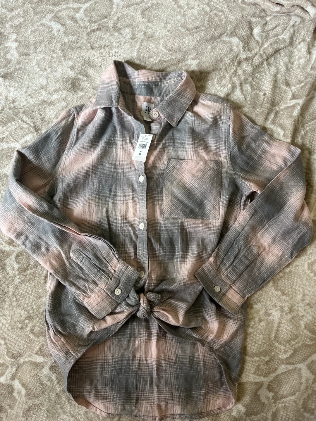 60Selling a GAP Kids flannel shirt in size S. It features a pink and gray plaid pattern. Perfect for layering or wearing on its own!