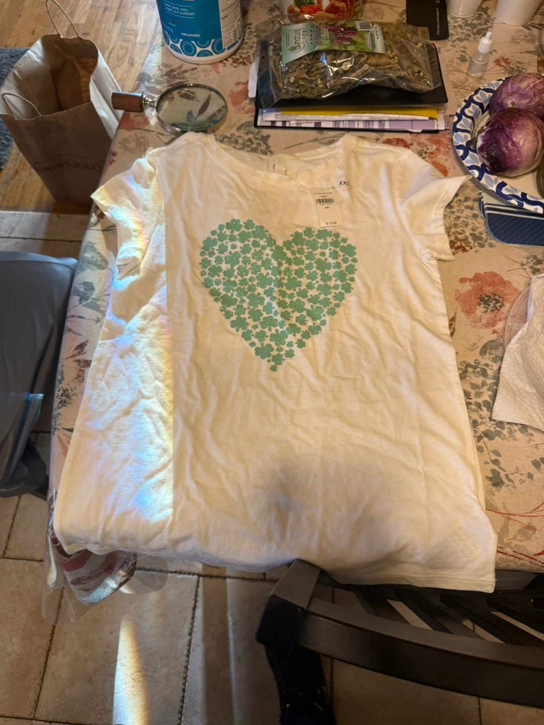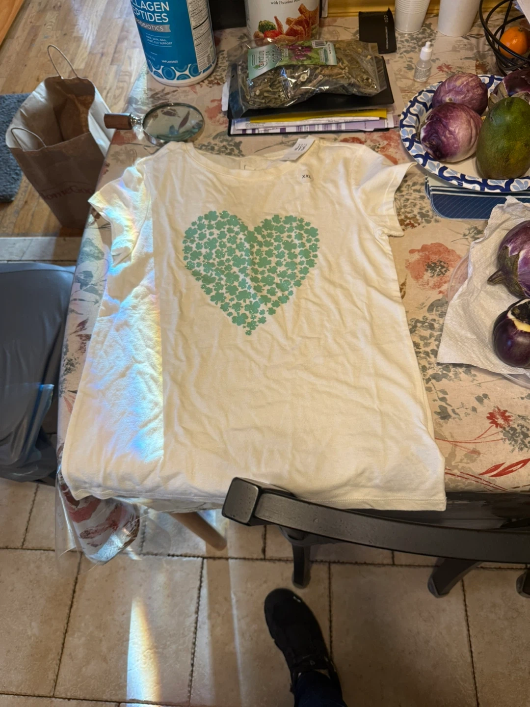 Selling a cute Gap Kids white t-shirt with a green shamrock heart design! It's in great condition and perfect for St. Patrick's Day or just adding a little luck to your wardrobe