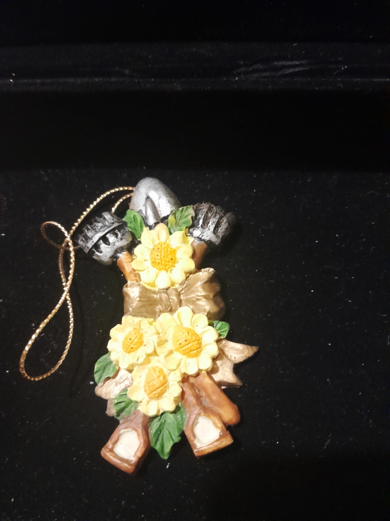 232Decorative ornament. Features gardening tools, sunflowers, and a bow. Includes a gold string for hanging. This ornament is perfect for those looking to add a touch of whimsy to their space.