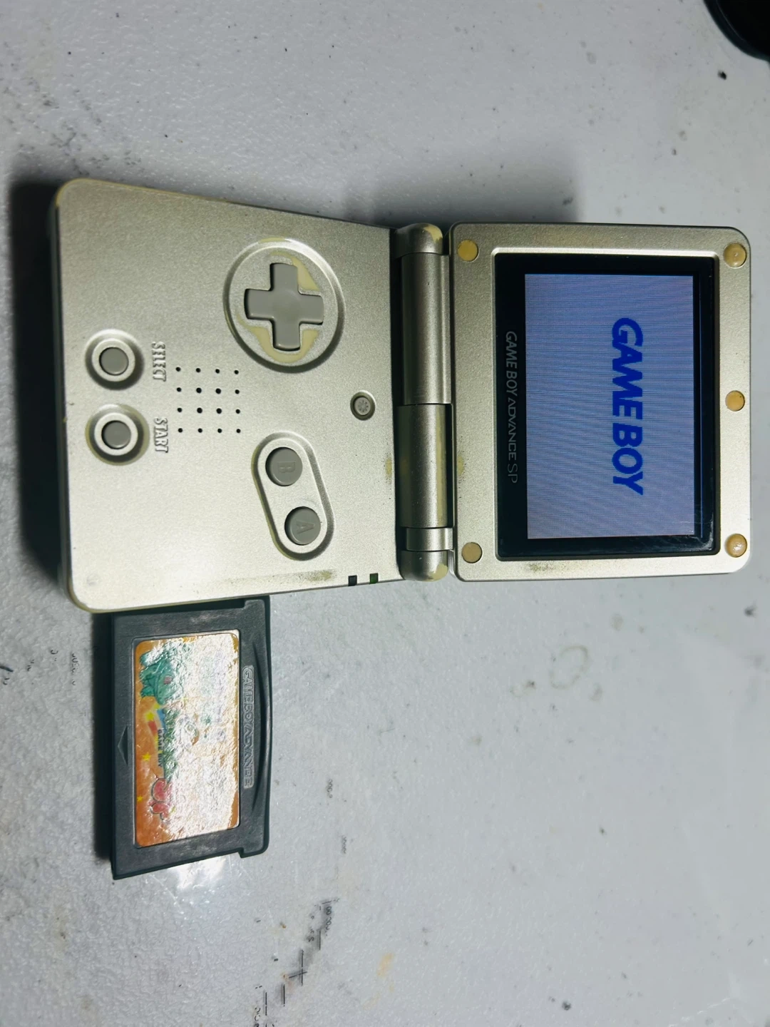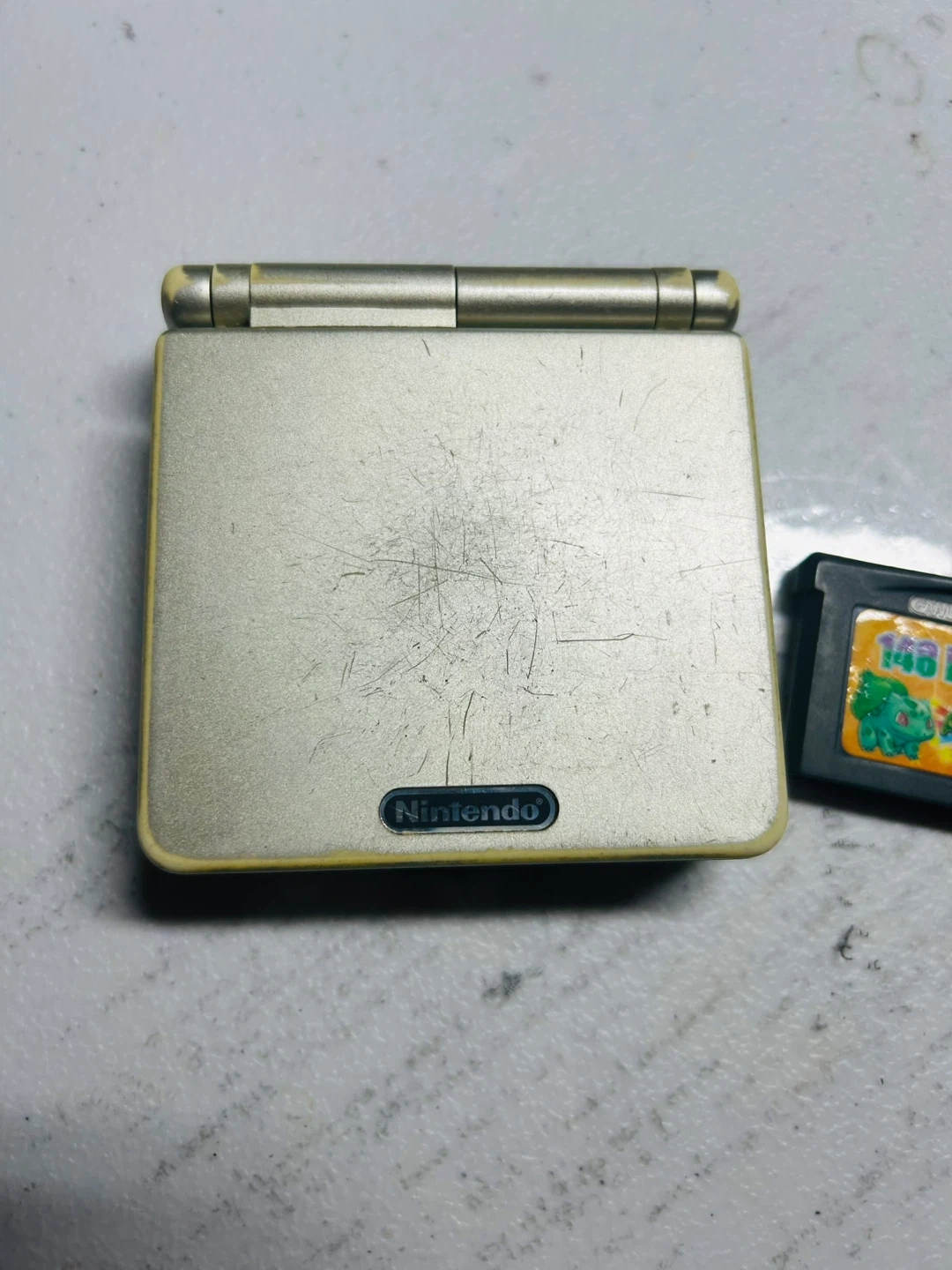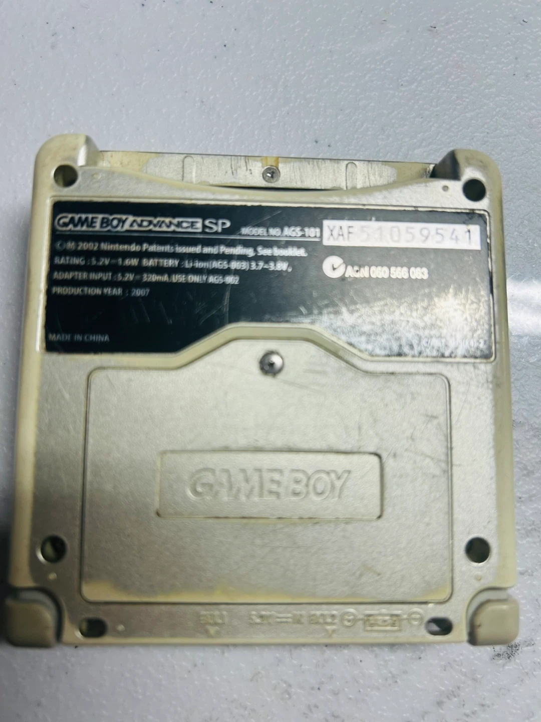 This is a silver Nintendo Game Boy Advance SP, model AGS-101. It was manufactured in 2007. The unit shows some signs of wear, including scratches on the casing. It's the backlit model, which provides a much brighter screen for gameplay. Comes with the game and can include charging cable.