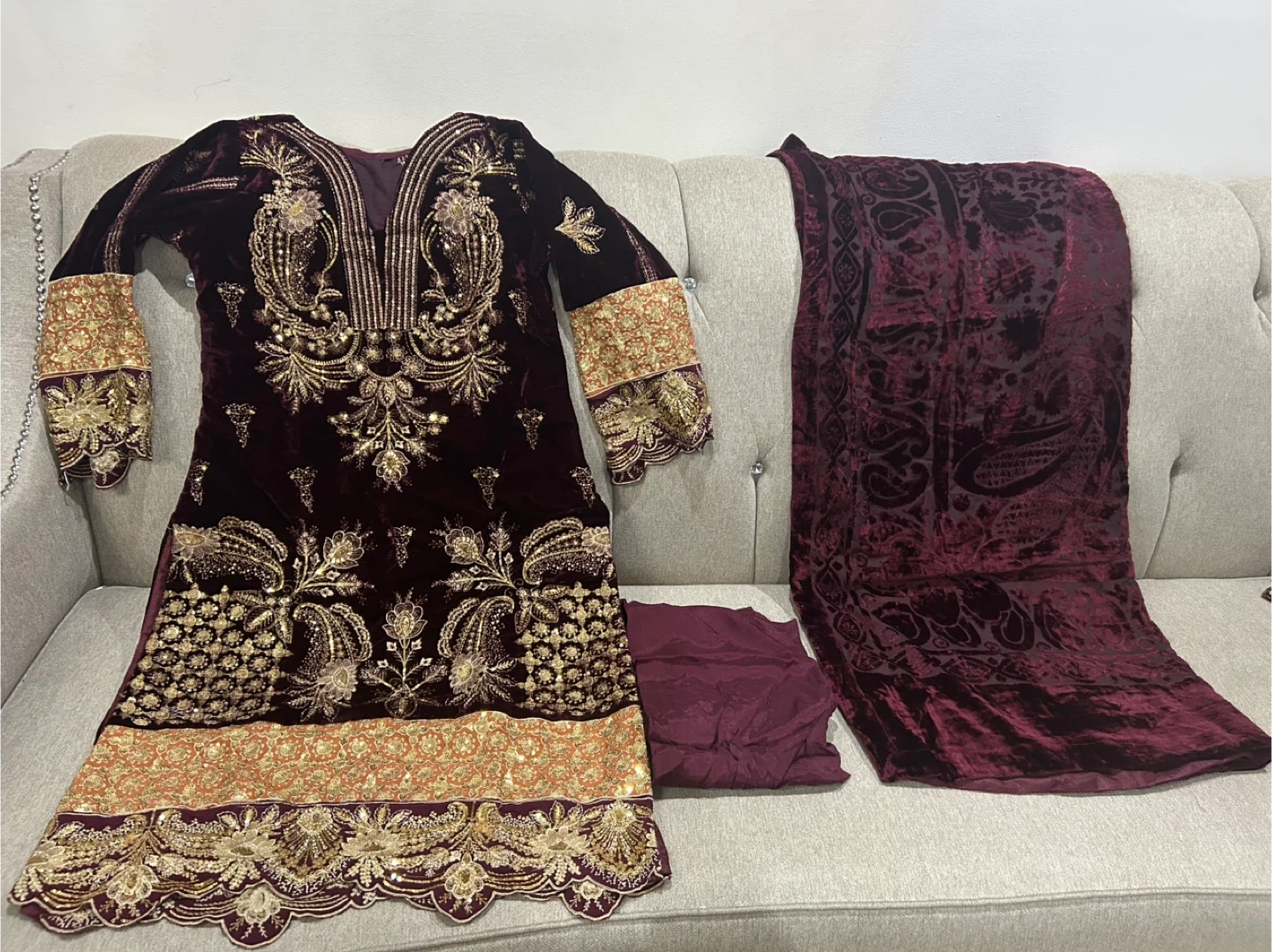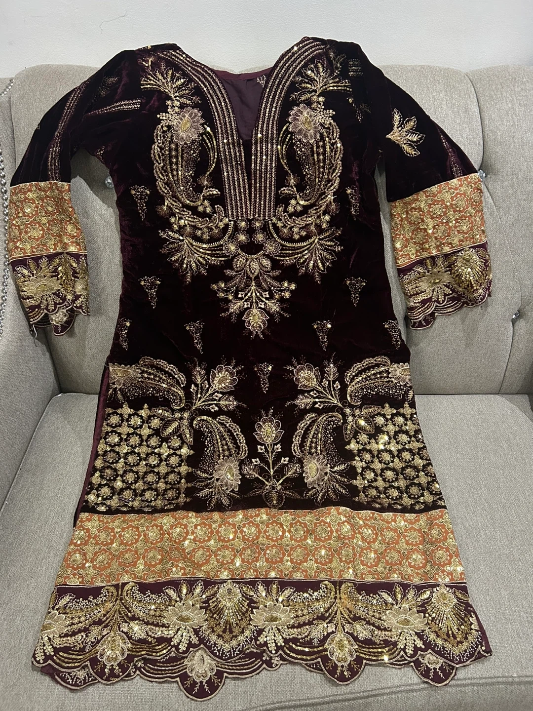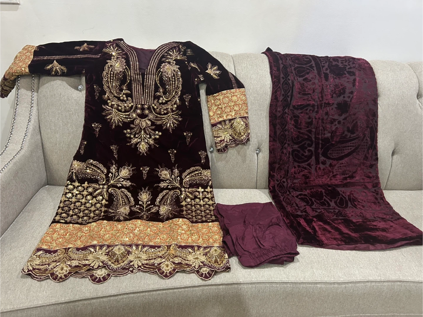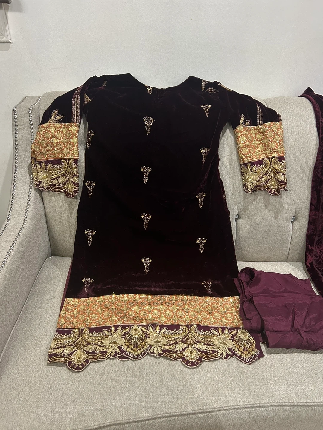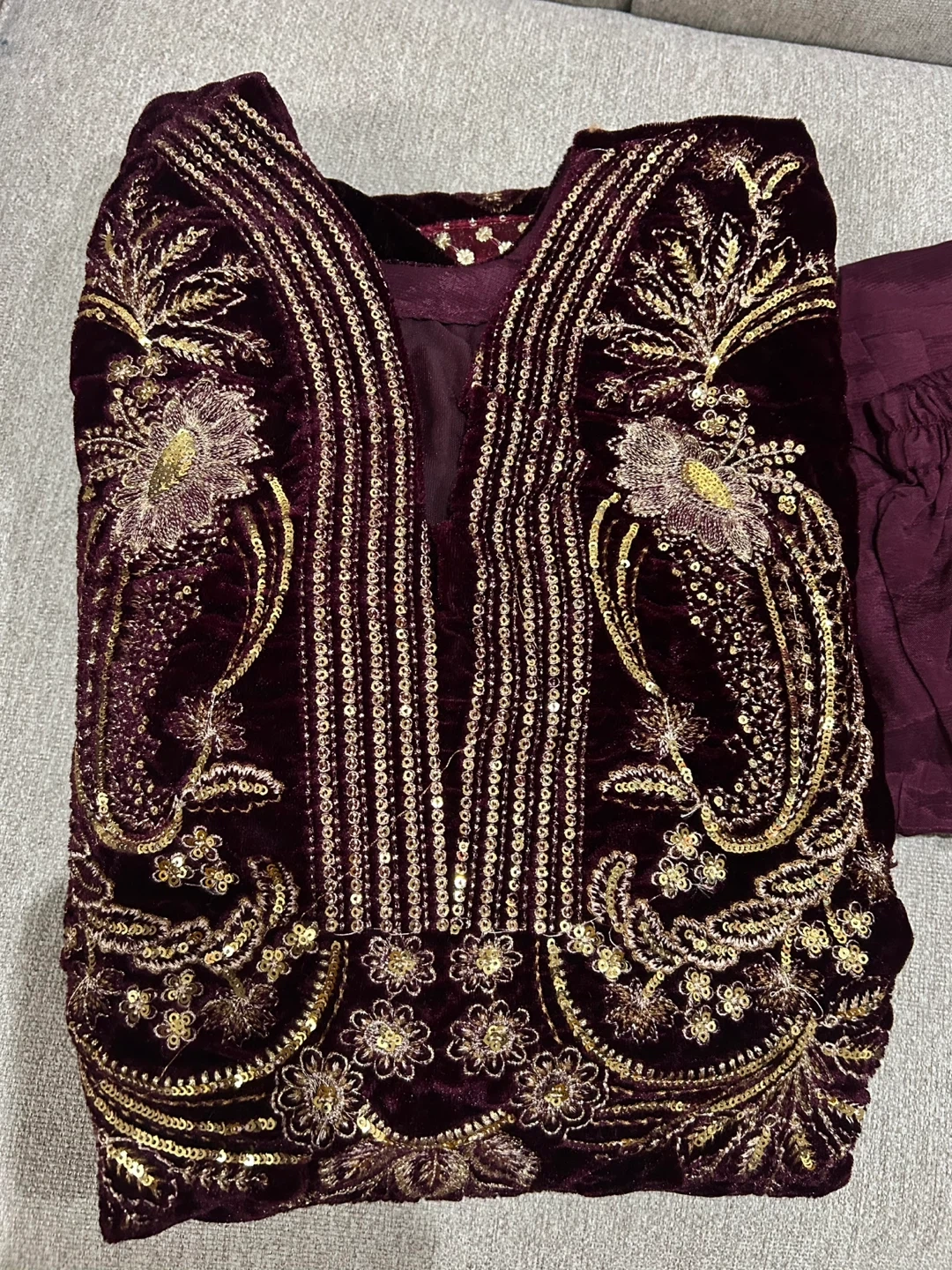 Gorgeous maroon velvet dress with intricate gold embroidery and sequin detailing. Comes with matching trousers and a velvet shawl. Perfect for special occasions!