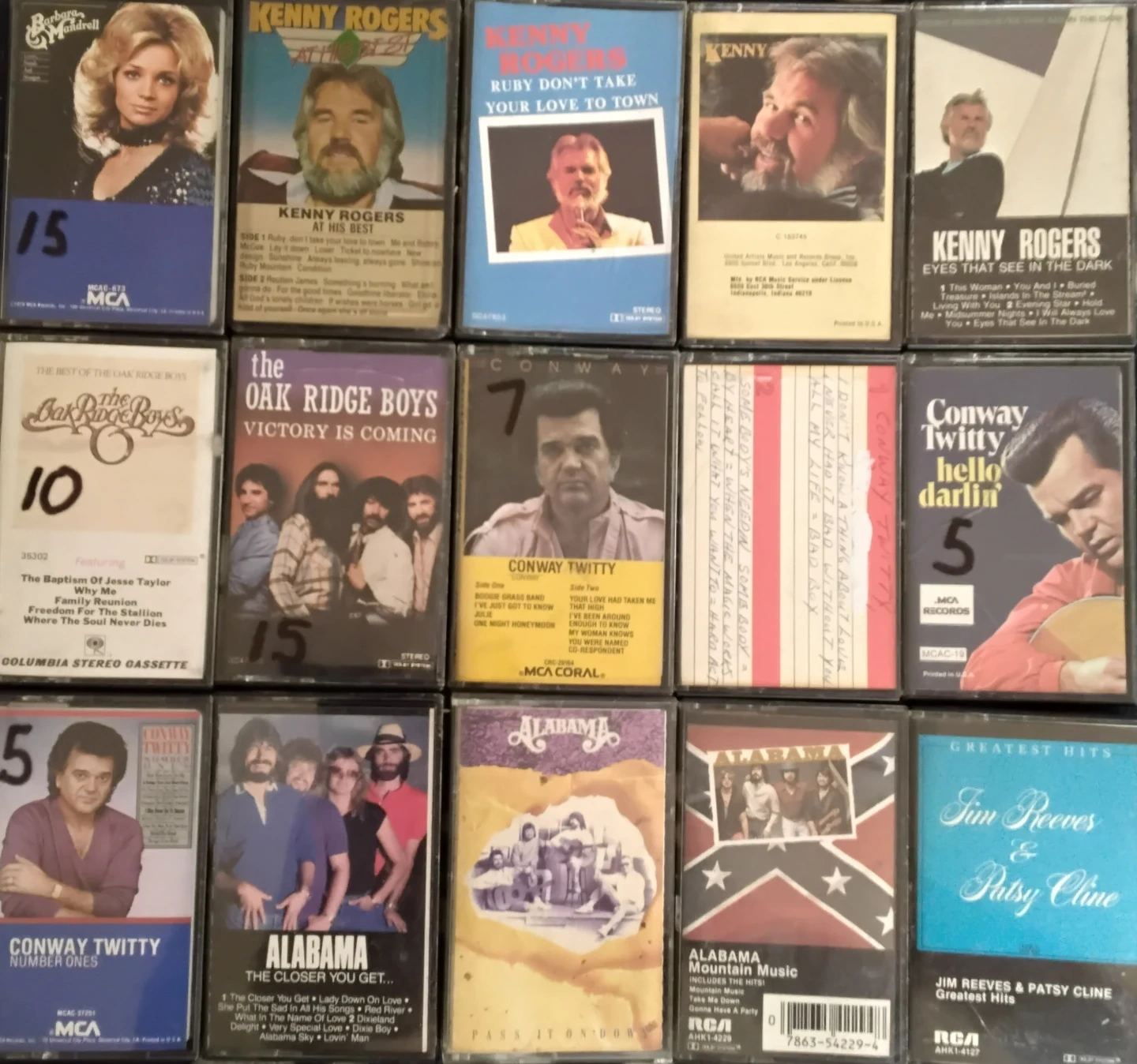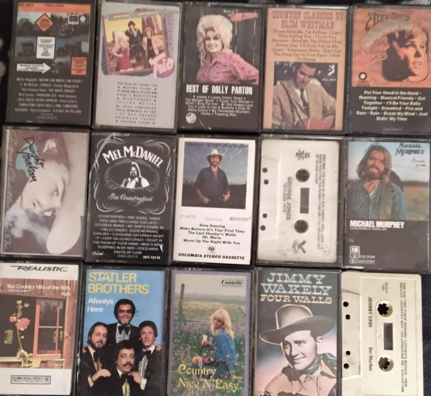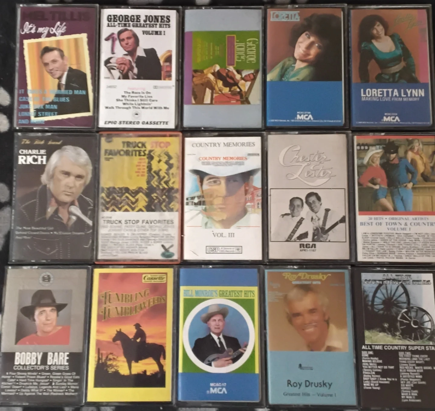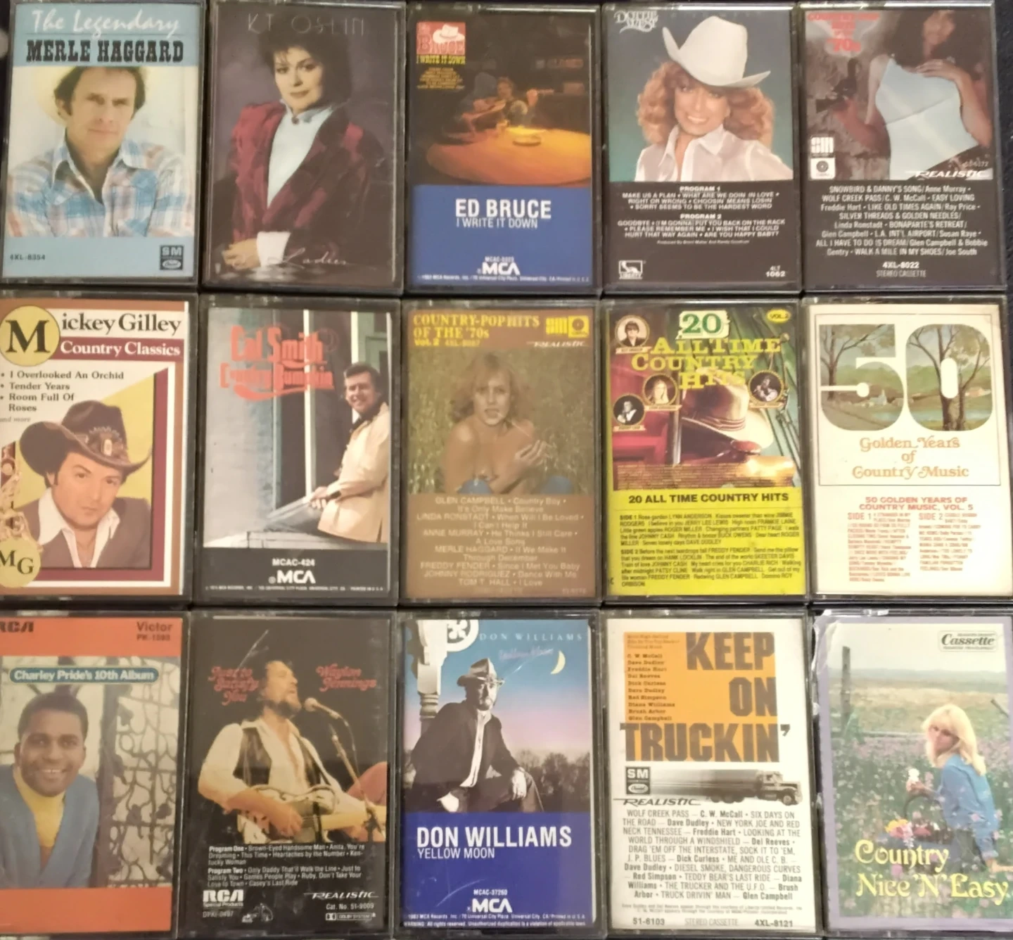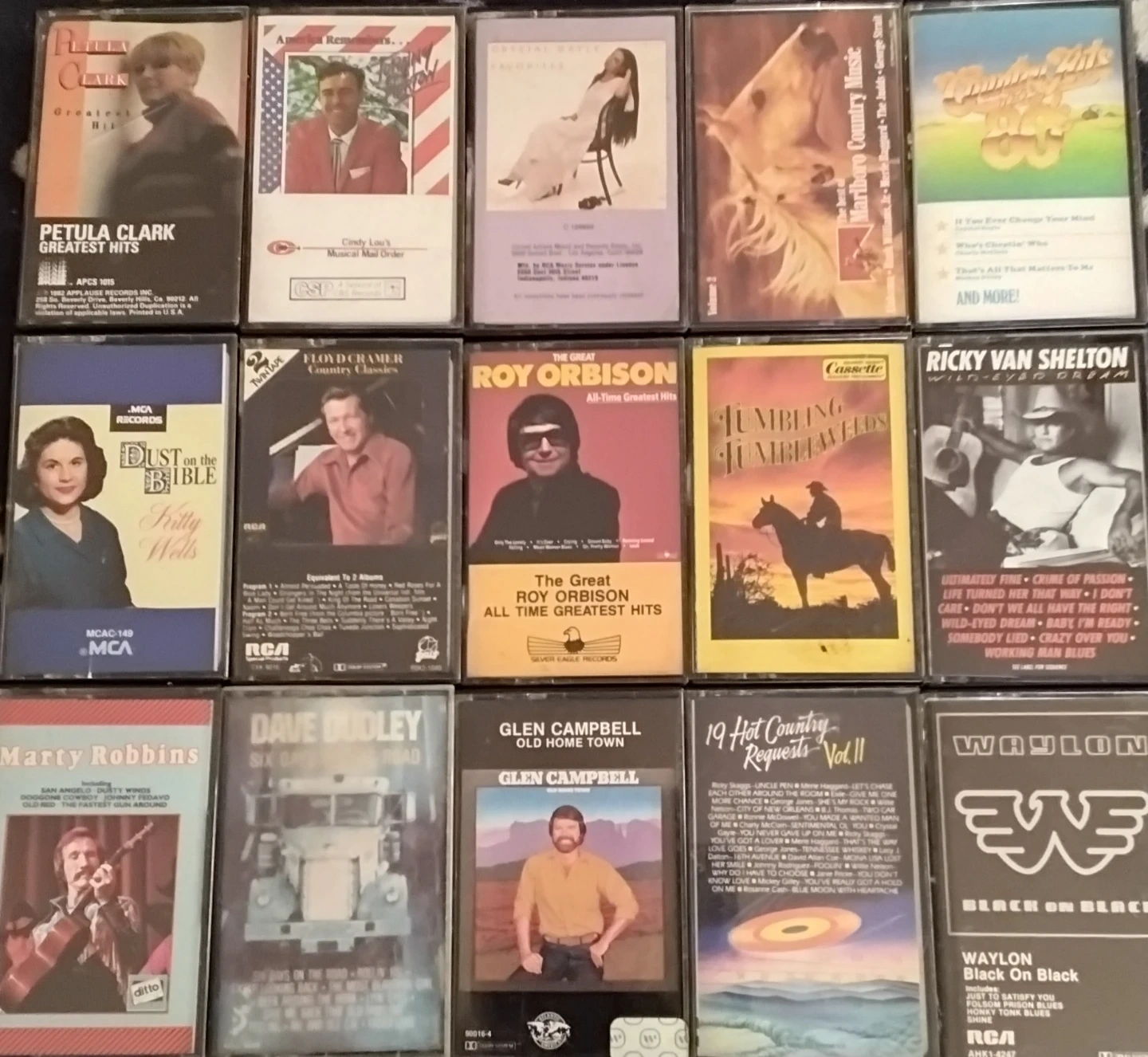 A collection of country music cassette tapes featuring various artists like Petula Clark, Ricky Van Shelton, Conway Twitty, and more. Tapes include greatest hits and studio albums. Format is cassette tape. 75 cassettes