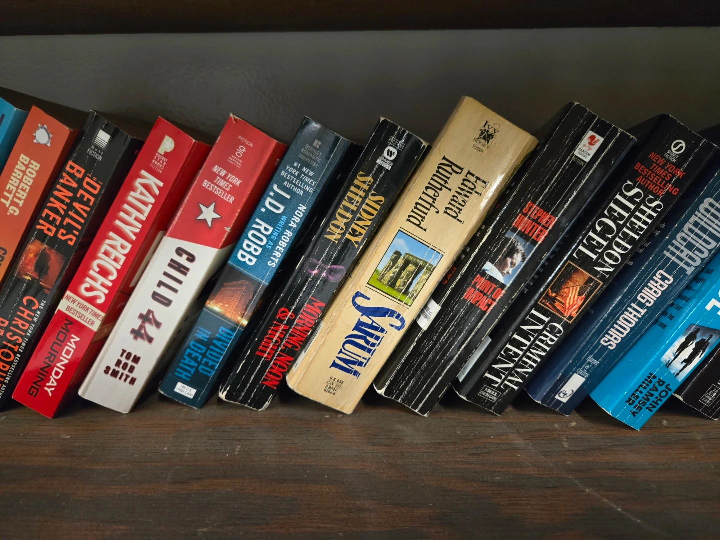 A collection of popular paperback books from various authors including J.D. Robb, Nora Roberts, and Stephen King. Titles range from crime thrillers to romantic suspense. Books are in good condition for reading. $5 each