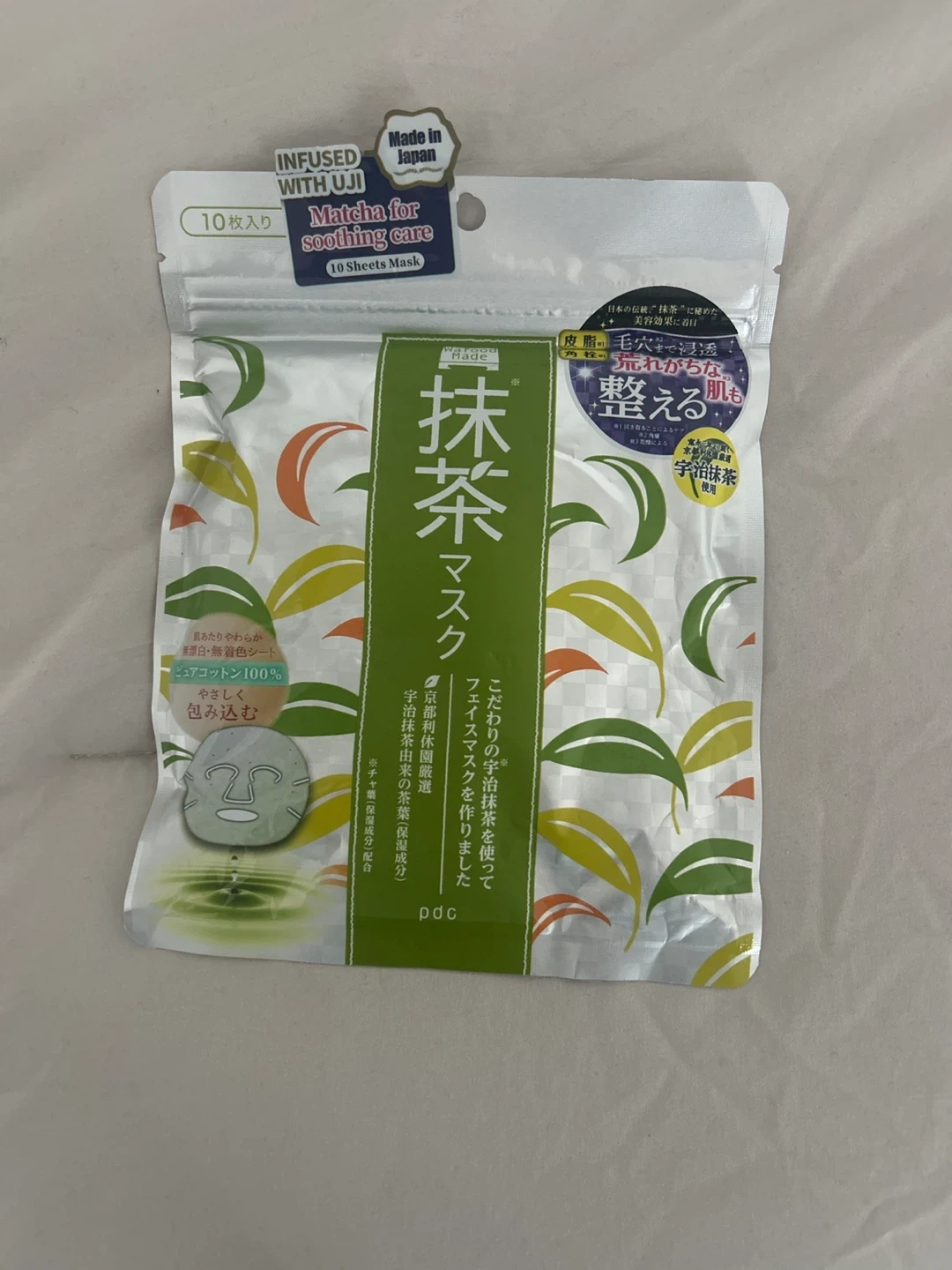 This pack includes 10 sheet masks infused with Uji matcha for soothing care. They're made with 100% pure cotton, unbleached and undyed, offering a gentle, wrapping feel. The masks are crafted with special Uji matcha for a beautifying effect.
