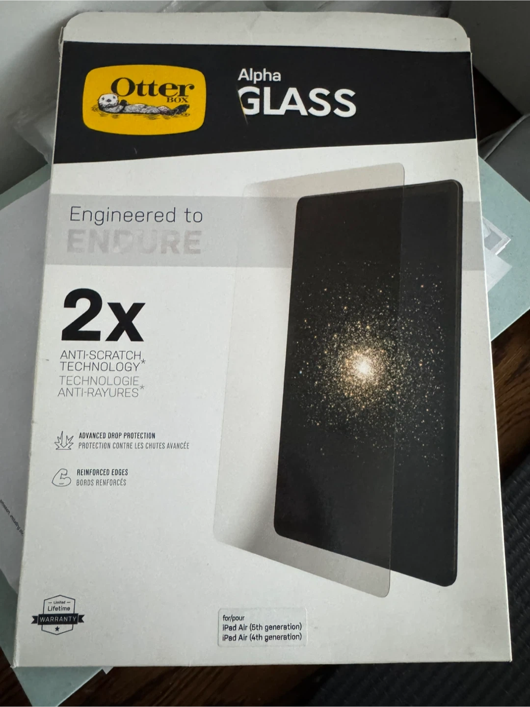 OtterBox Alpha Glass screen protector. Offers 2x anti-scratch technology and advanced drop protection. Designed for iPad Air (5th generation) and iPad Air (4th generation).
