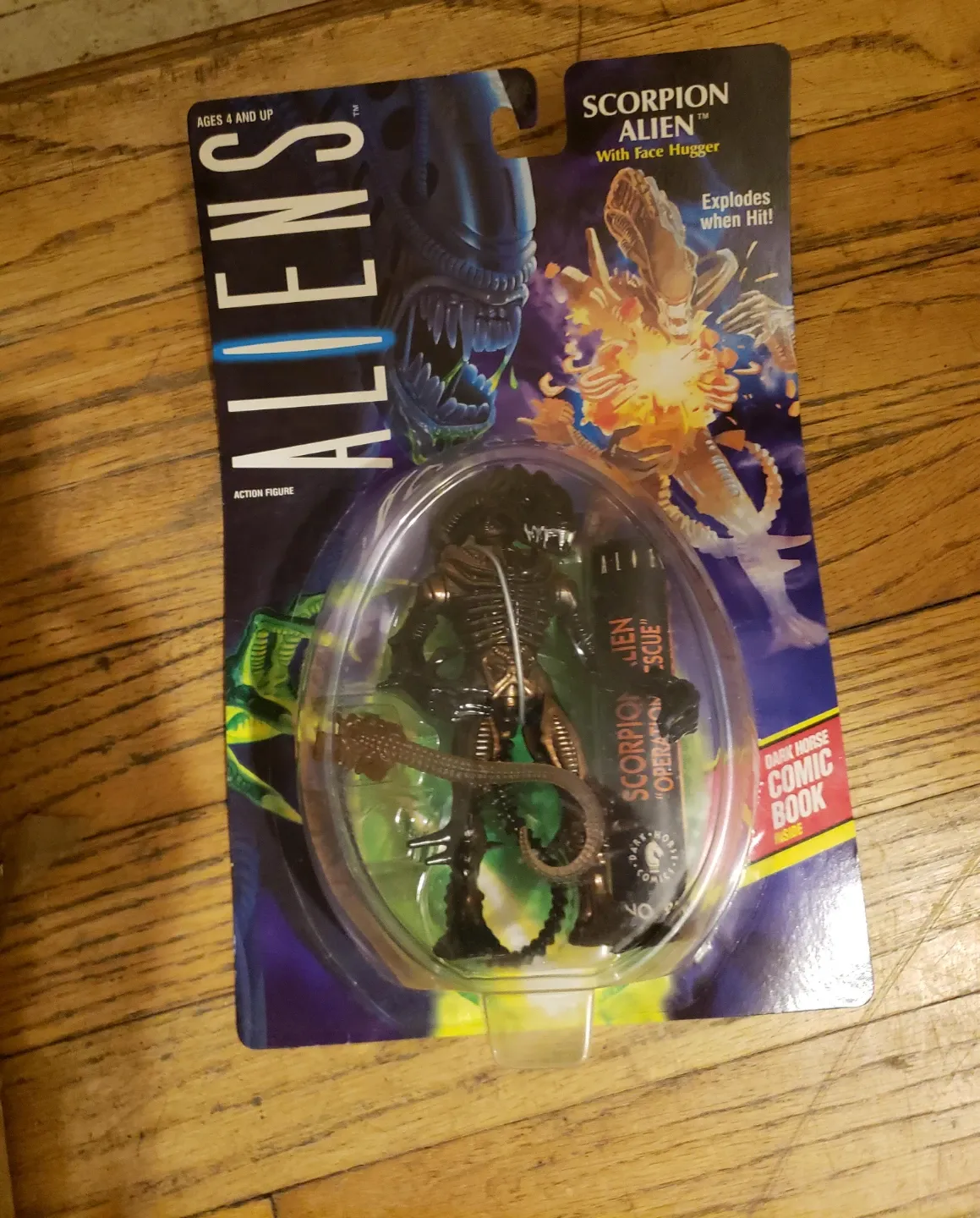 This is an action figure of the Scorpion Alien from Aliens. It comes with a Face Hugger accessory. The toy is designed to 'Explode when Hit!' Ages 4 and up. Never opened mint condition.