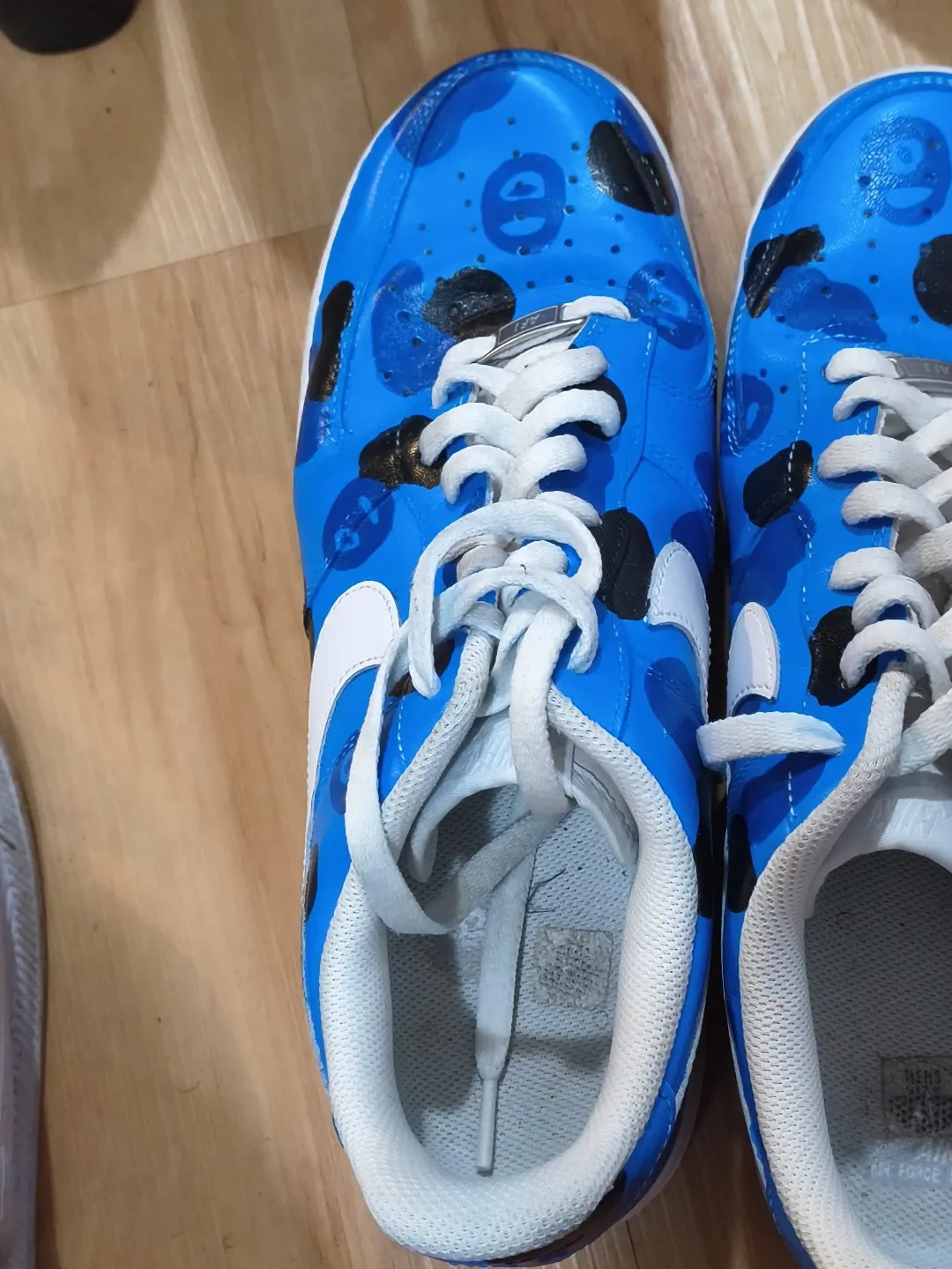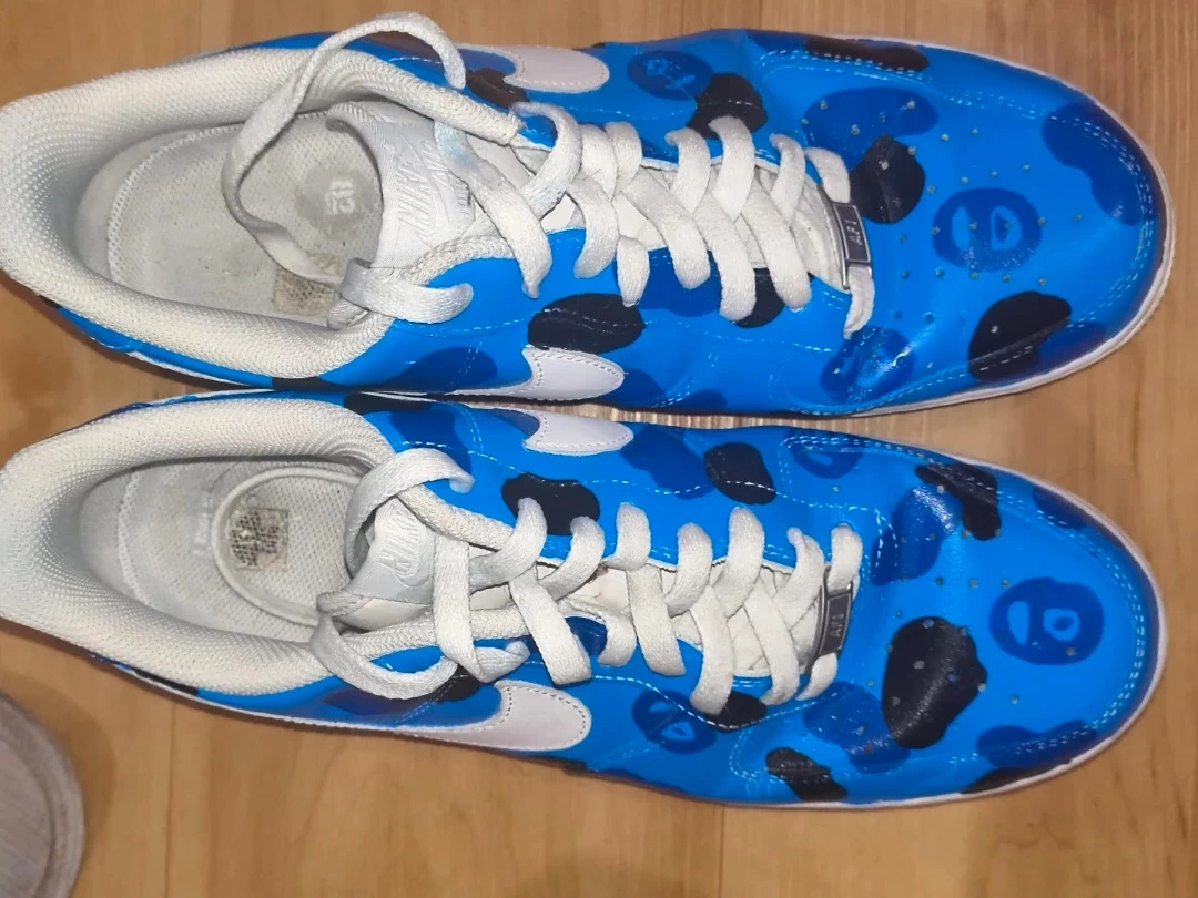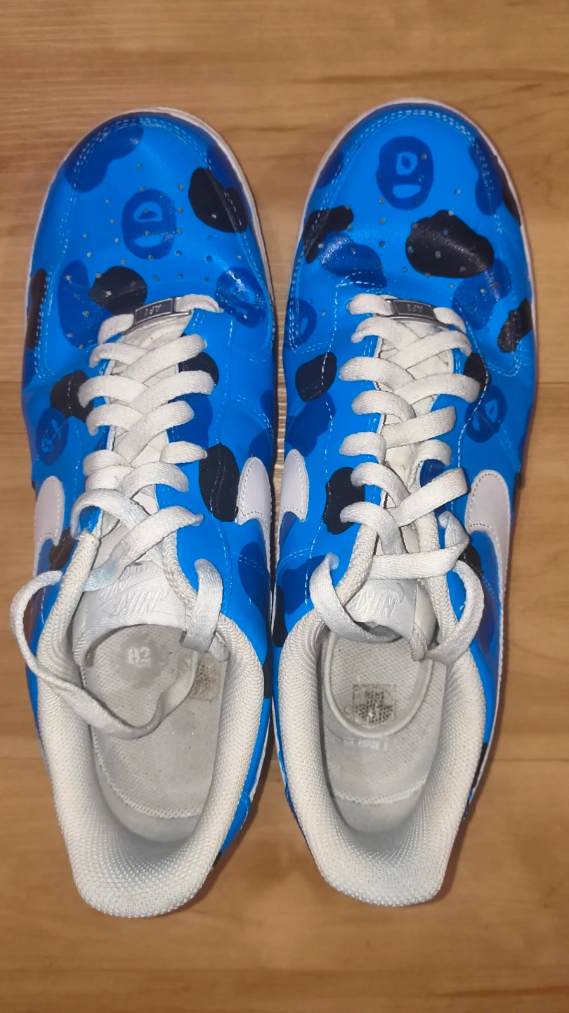Custom painted Nike Air Force 1 sneakers with a Bape-inspired blue camo design. These are eye-catching and unique.