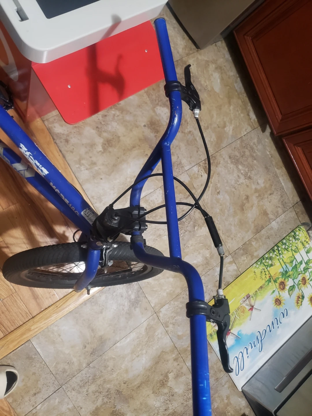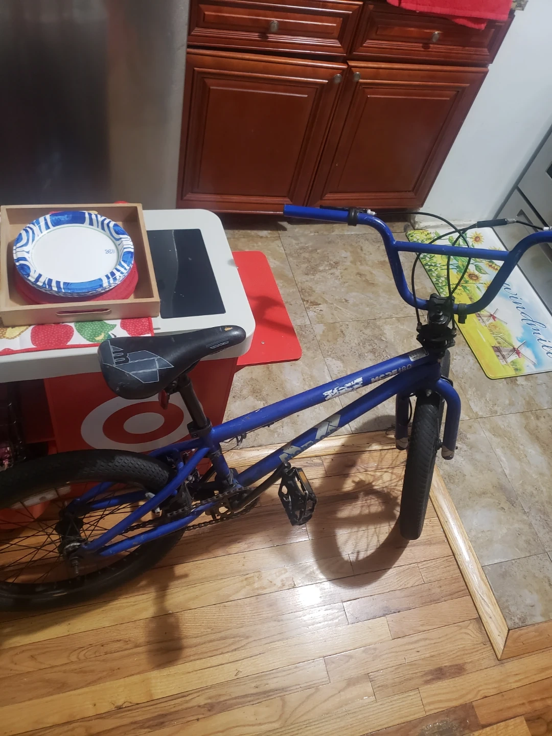 This is a blue BMX bike. It has a steel frame and BMX tires. It's suitable for tricks and riding around. The breaks don't work well