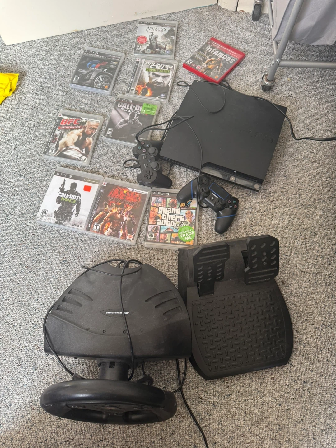 Selling a black PlayStation 3 console along with a collection of PS3 games. Includes two controllers and a Thrustmaster racing wheel with pedals. Games include UFC Undisputed, Call of Duty MW3, Grand Theft Auto, Assassin's Creed, Infamous, and Splinter Cell Double Agent. It's a great bundle for racing and action game fans!