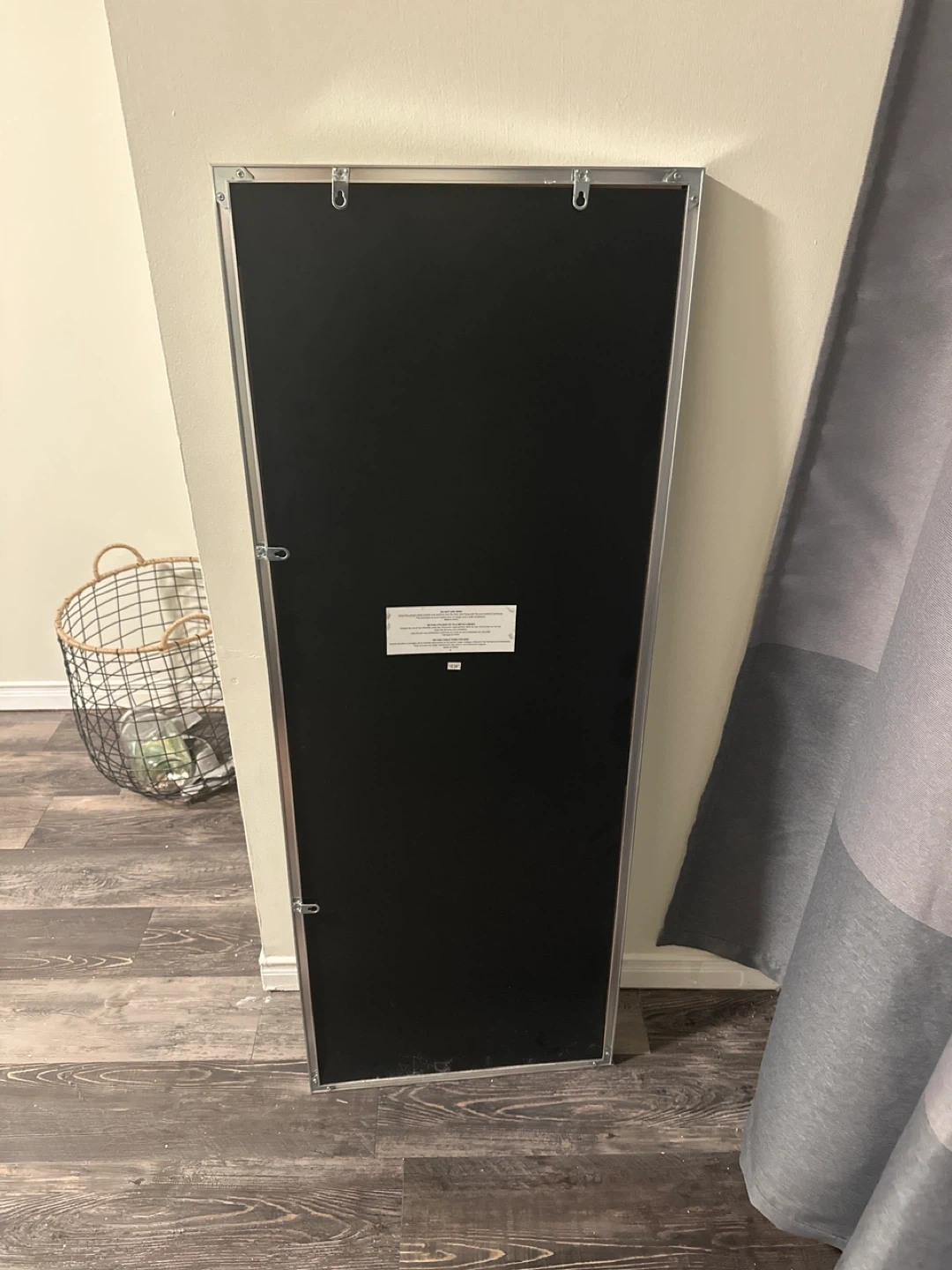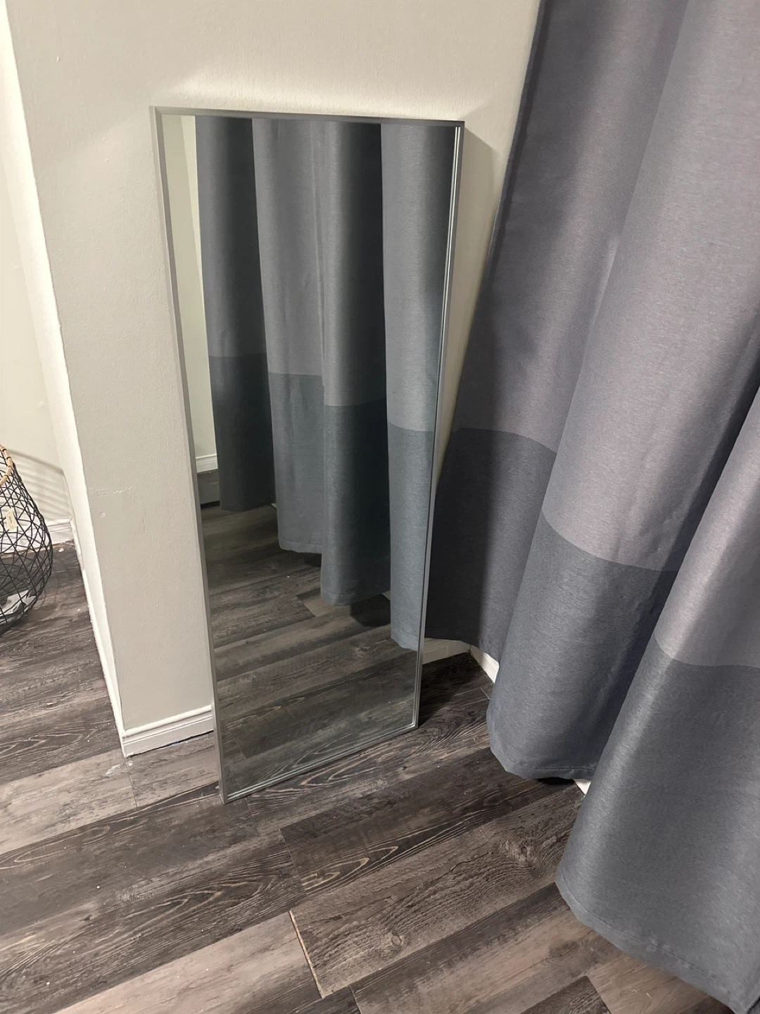 Selling a full-length mirror with a silver frame. It's in great condition and ready to brighten up any room! It has hooks on the back for easy hanging.