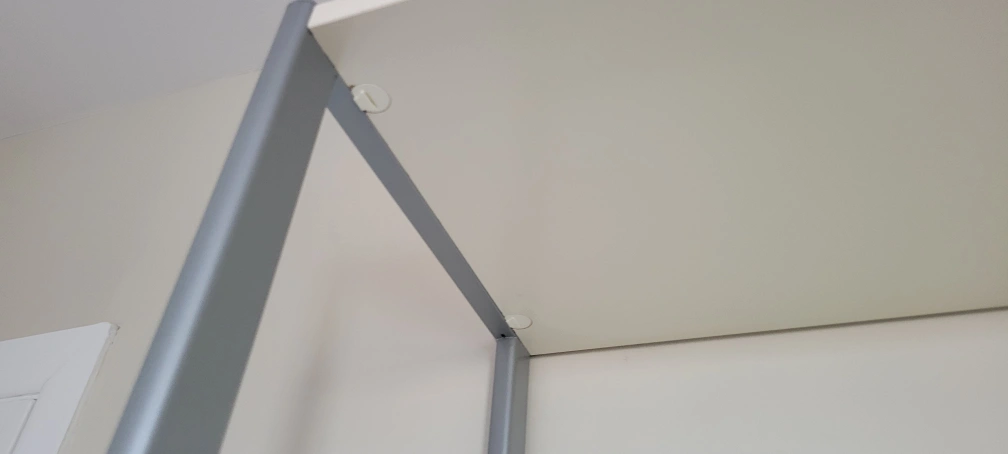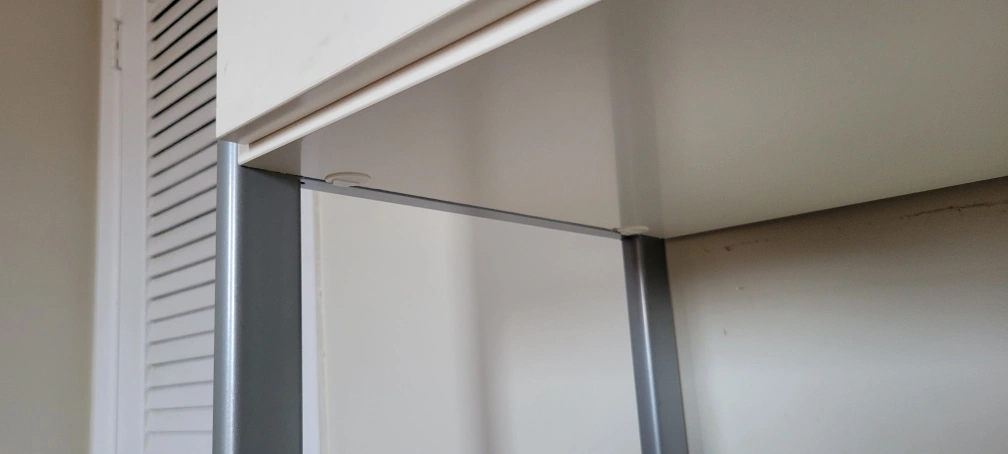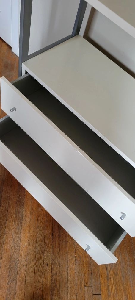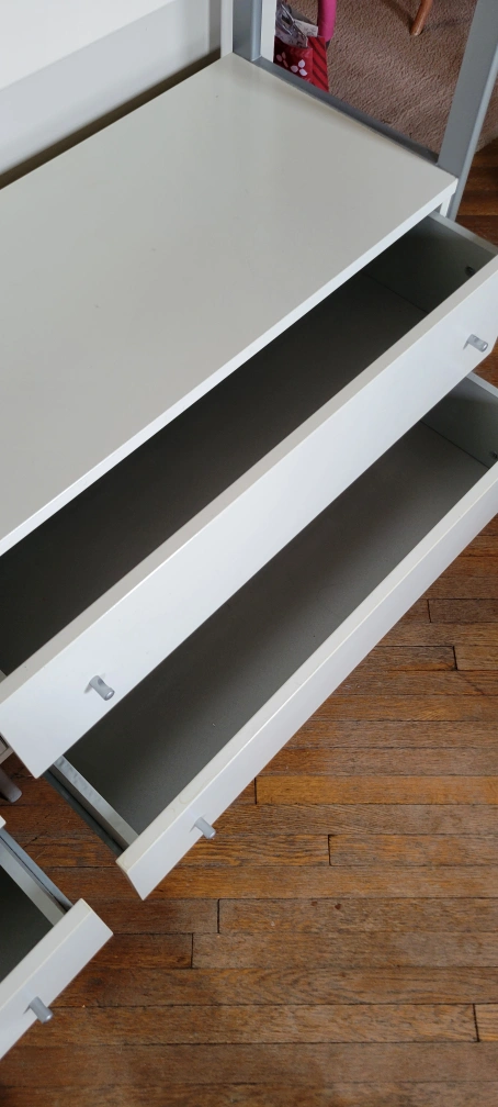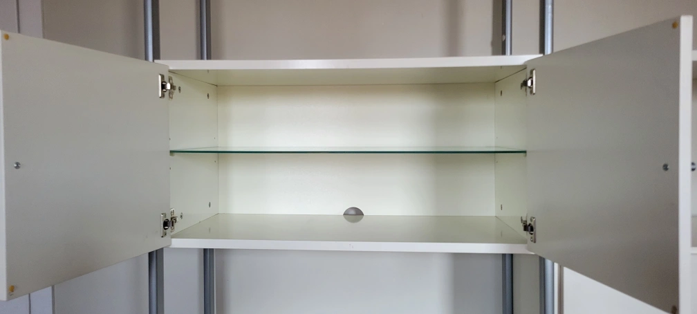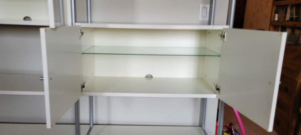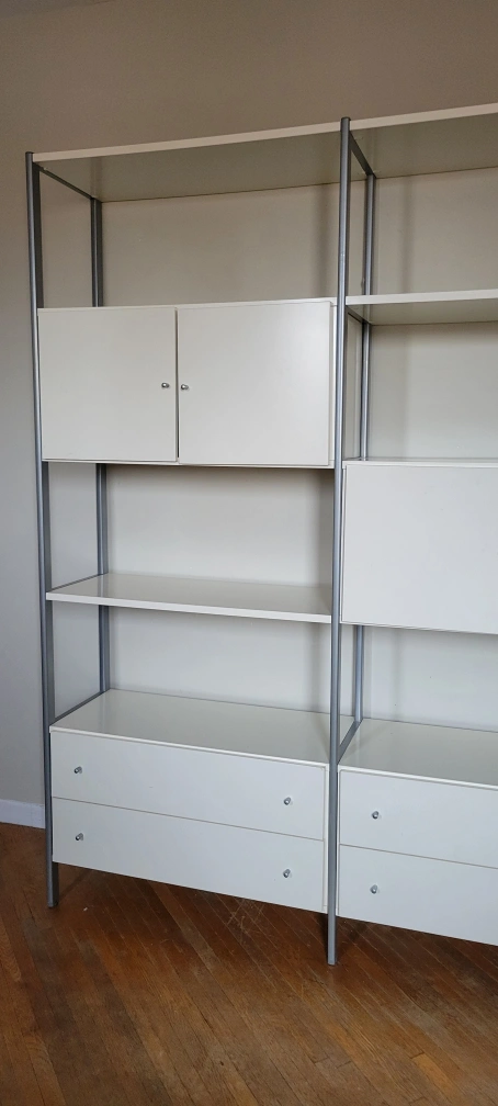 White laminate shelving unit with metal frame. Features adjustable shelves, drawers, and cabinets. Great for living room or office. Lots of storage.