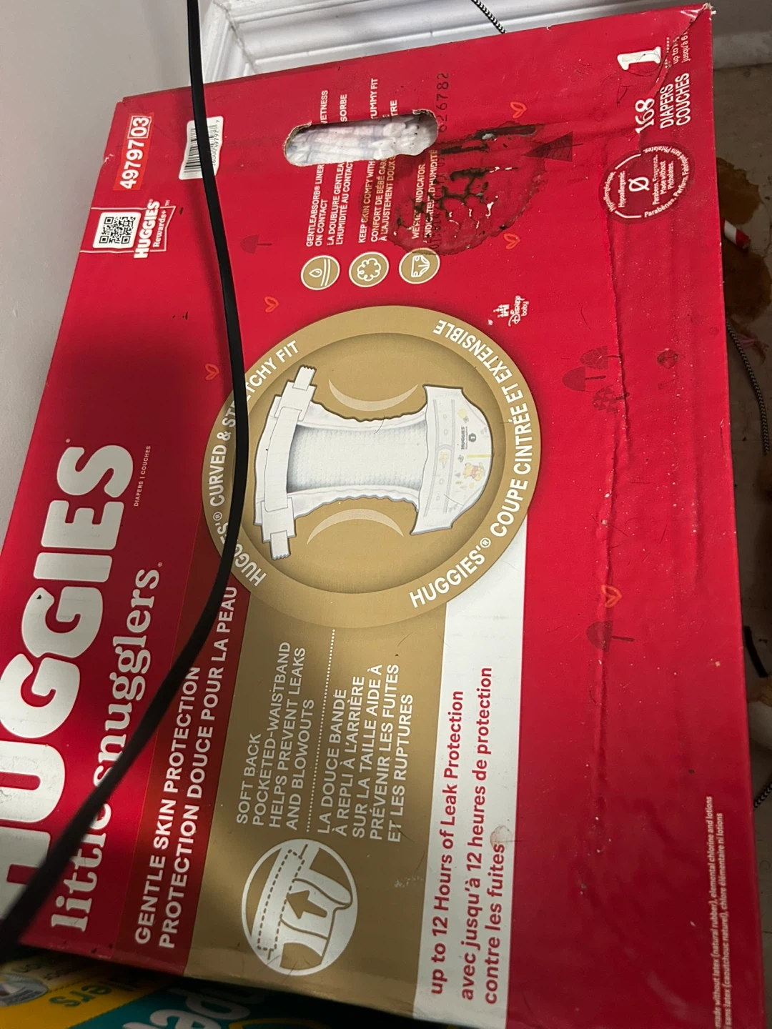 Sealed brand new box. Box is damaged. Diapers are fine.