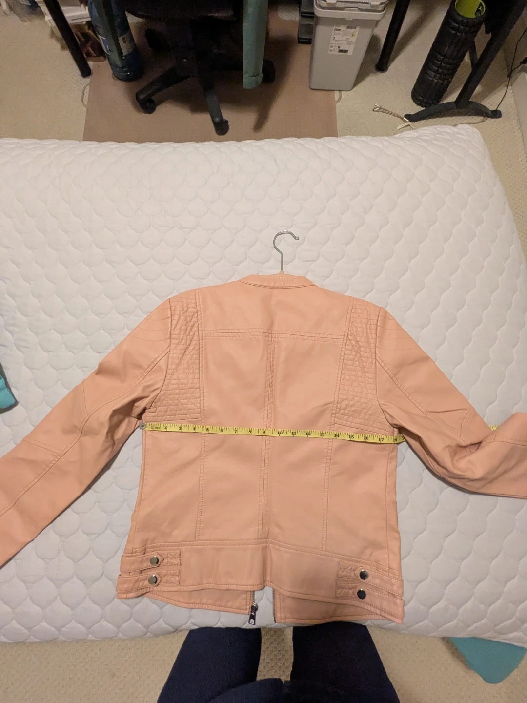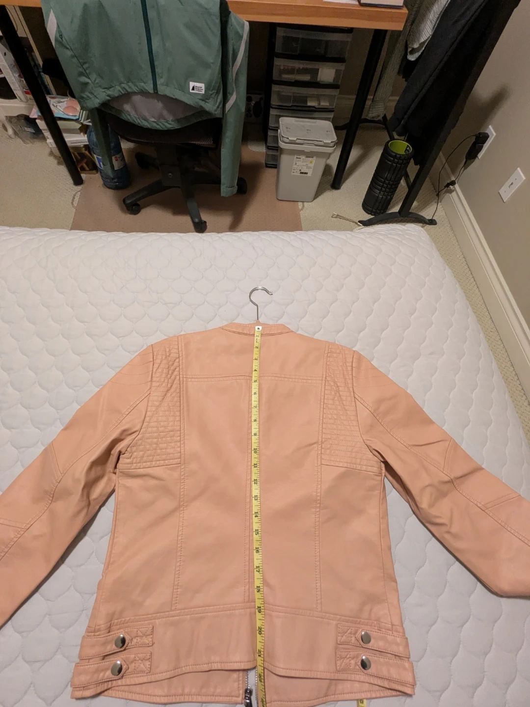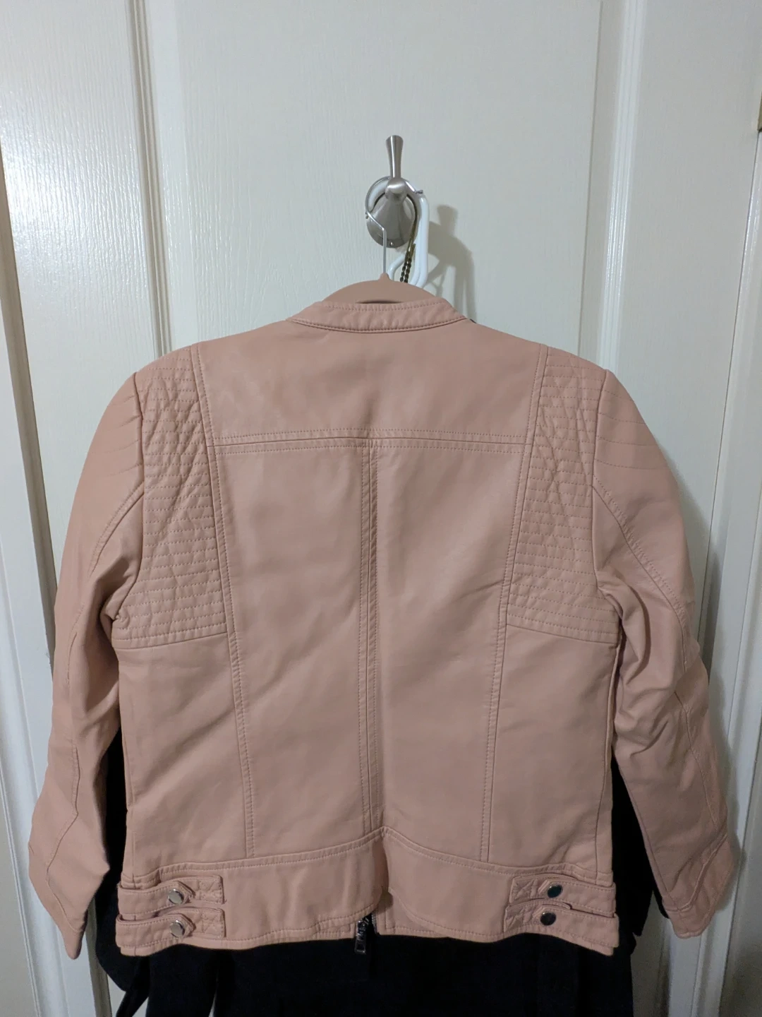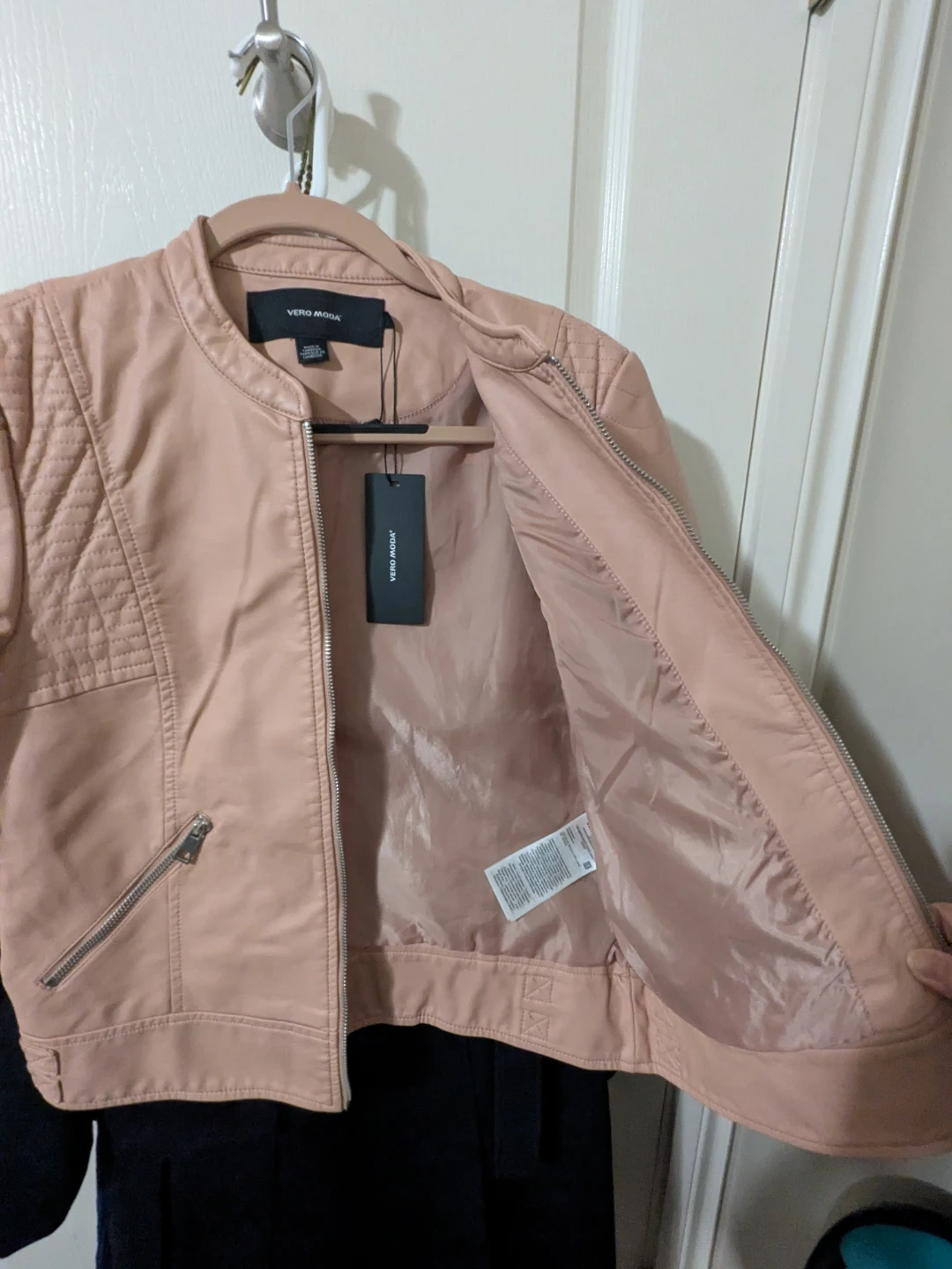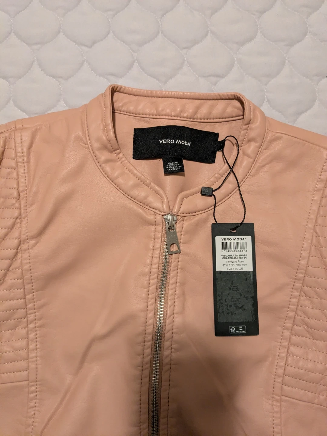 This is a VERO MODA faux leather short jacket in a lovely pink colour. It's in new condition and still has the tags attached ! It has a stylish design with quilted detailing on the shoulders and a zipper closure. Size small, fits size 4-6 women's