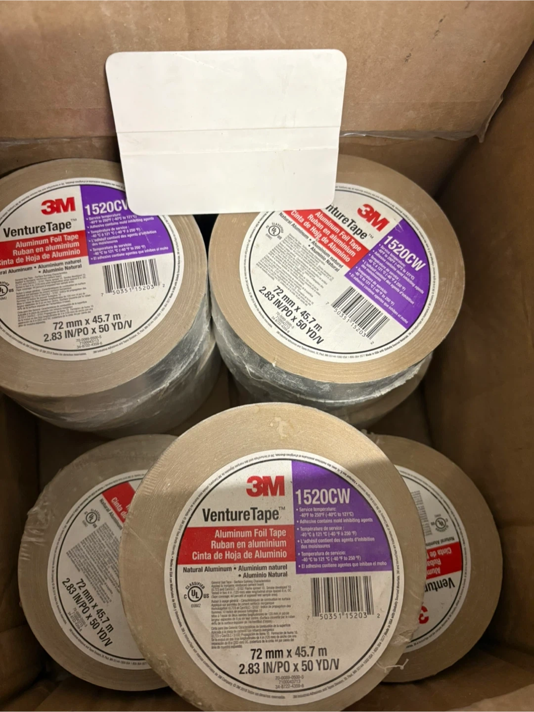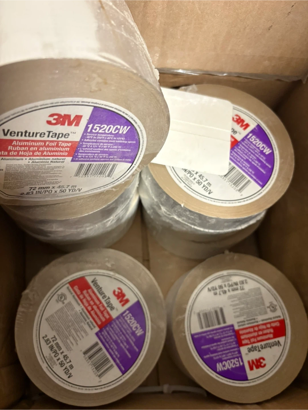 Selling 7 rolls of 3M VentureTape 1520CW Aluminum Foil Tape. Each roll measures 72 mm x 45.7 m (2.83 in/PO x 50 YD/V). This tape is designed for use in various industrial applications.