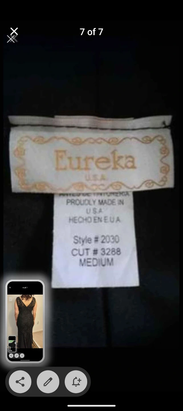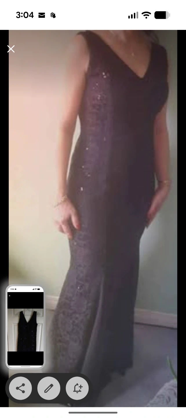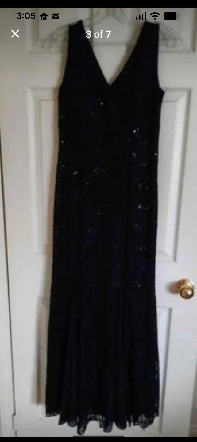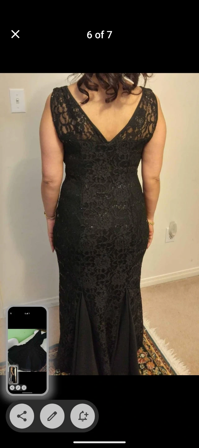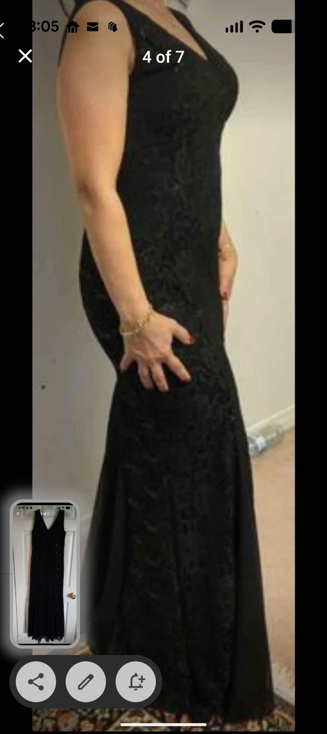 Selling a beautiful black lace formal gown. It features a V-neck and a fitted silhouette. Perfect for a special occasion!