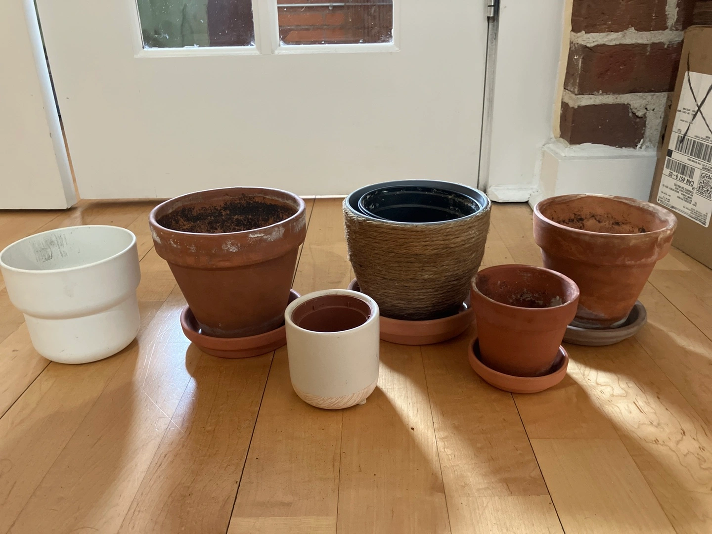 Collection of various plant pots and saucers. Includes terracotta, white plastic, and rope-wrapped styles. Different sizes and shapes suitable for indoor or outdoor plants. Message for individual pricing. Will do bundle discounts!