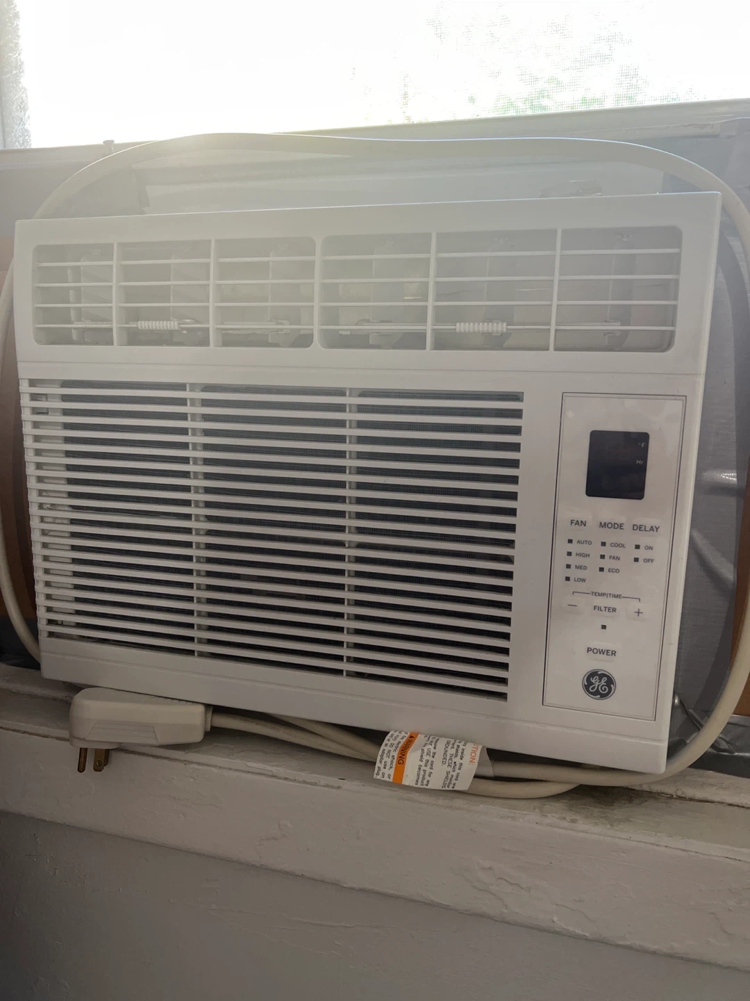 Selling a GE window air conditioner. It has fan, mode, and delay settings. It also has a temperature and filter setting.