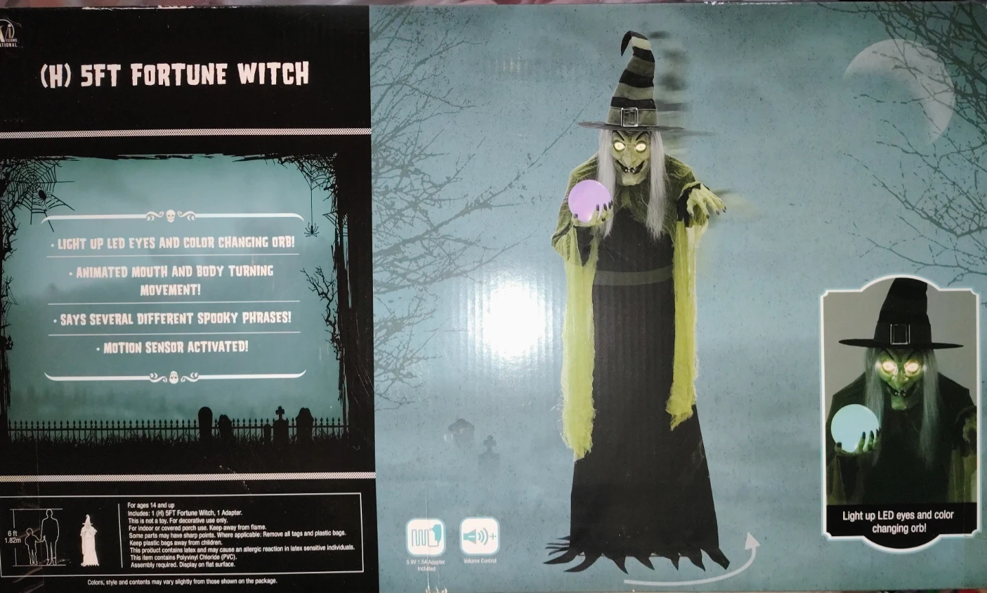 This 5ft Fortune Witch animatronic features light-up LED eyes and a color-changing orb. It includes animated mouth and body turning movement, and says several spooky phrases. It's motion sensor activated and comes with an adapter. For ages 14 and up.