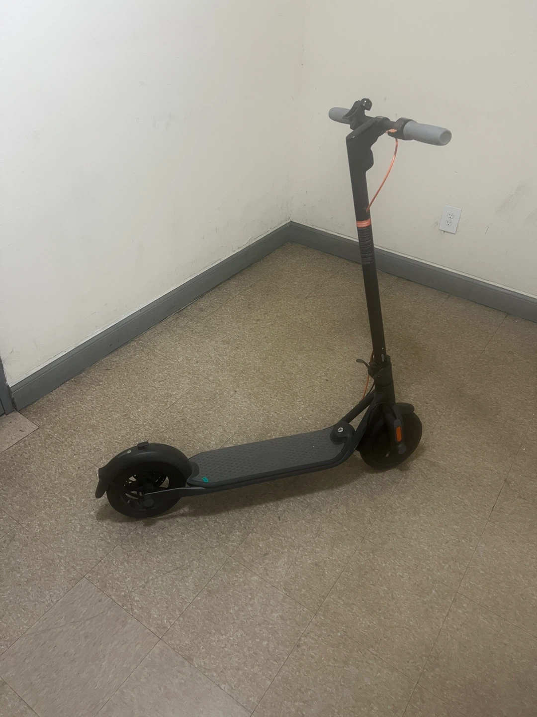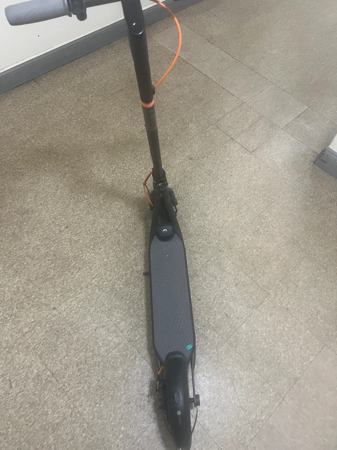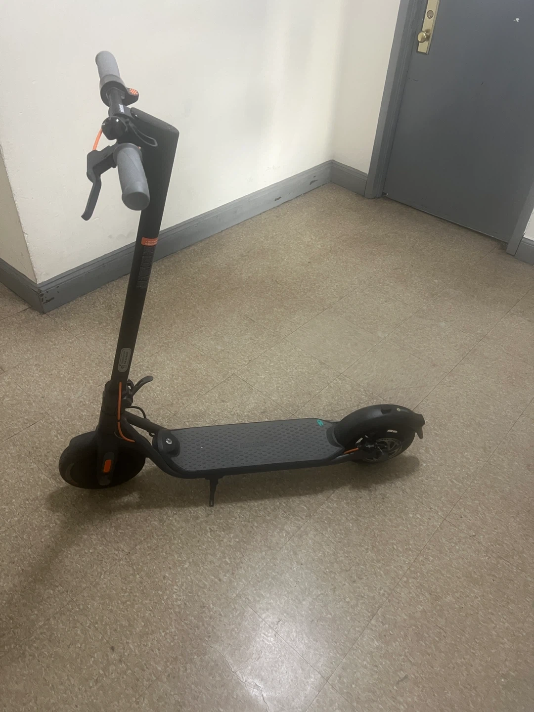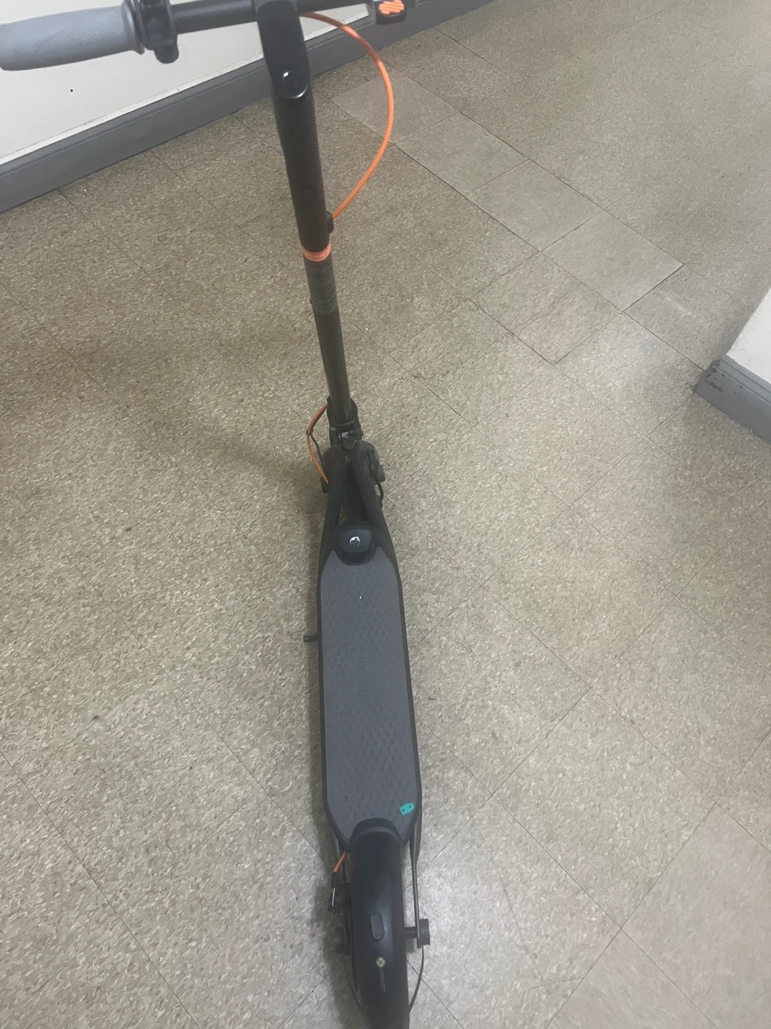 This is a Ninebot electric scooter. It's gray with orange accents. It features electronic and drum brakes with a max power of 500W. This scooter has a top speed of 15.5 mph and a max slope of 12%.