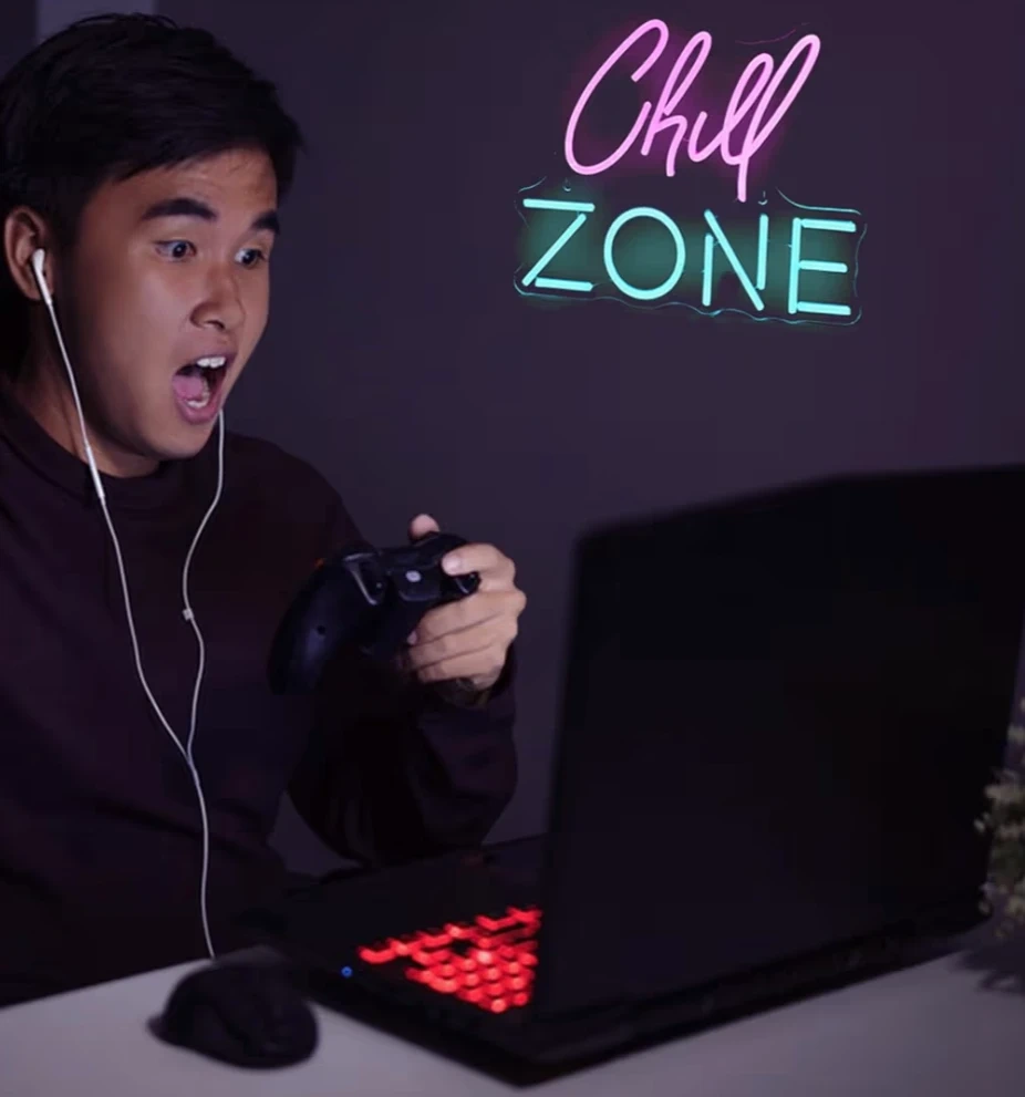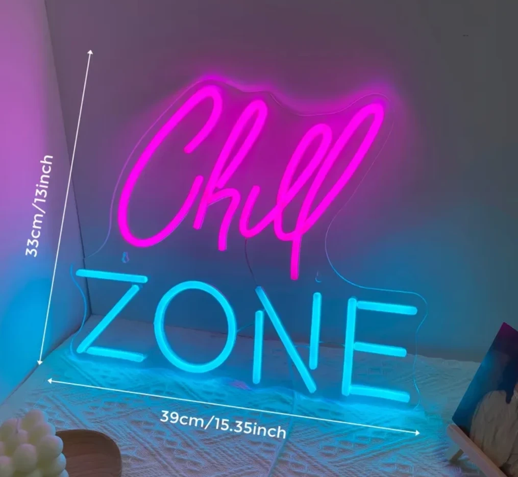 This "Chill Zone" neon sign has bright pink and blue LED lights. It's made of acrylic and measures 39cm by 33cm. Perfect for adding a fun vibe to your room or gaming space!