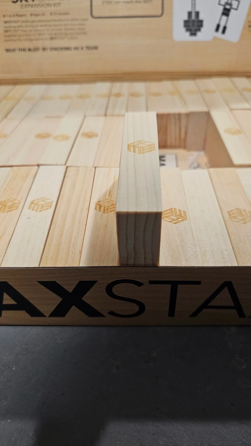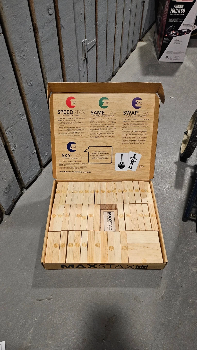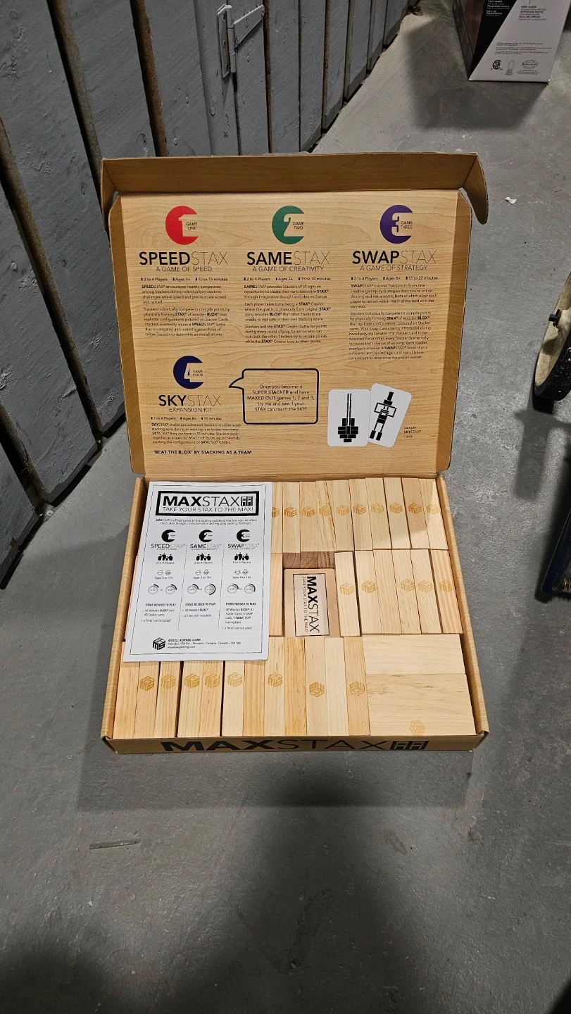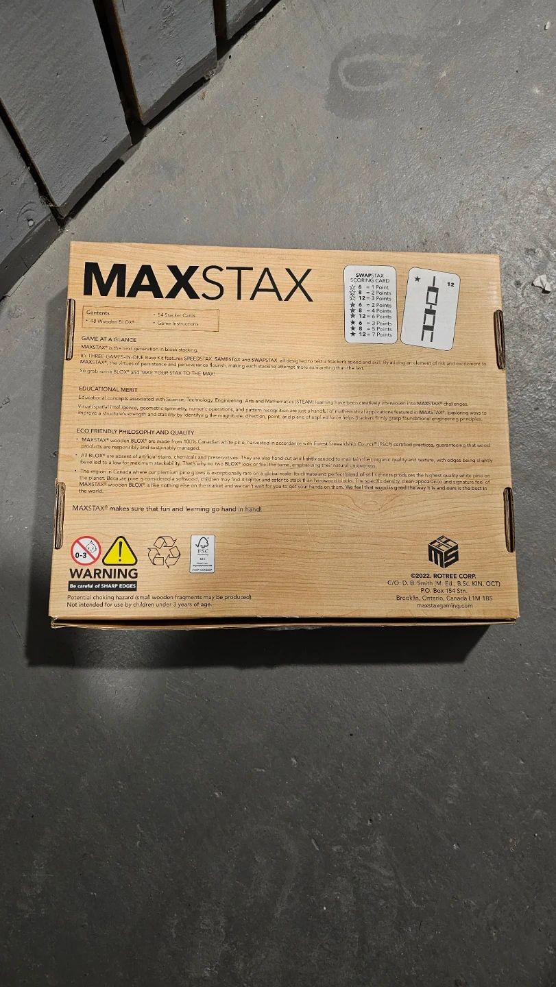 Selling a brand new MAXSTAX wooden game set, includes 48 wooden blocks for three different games: SPEEDSTAX, SAMESTAX, and SWAPSTAX. It's designed for educational and competitive play with STEM concepts. This set is made from Canadian FSC-certified lumber.
