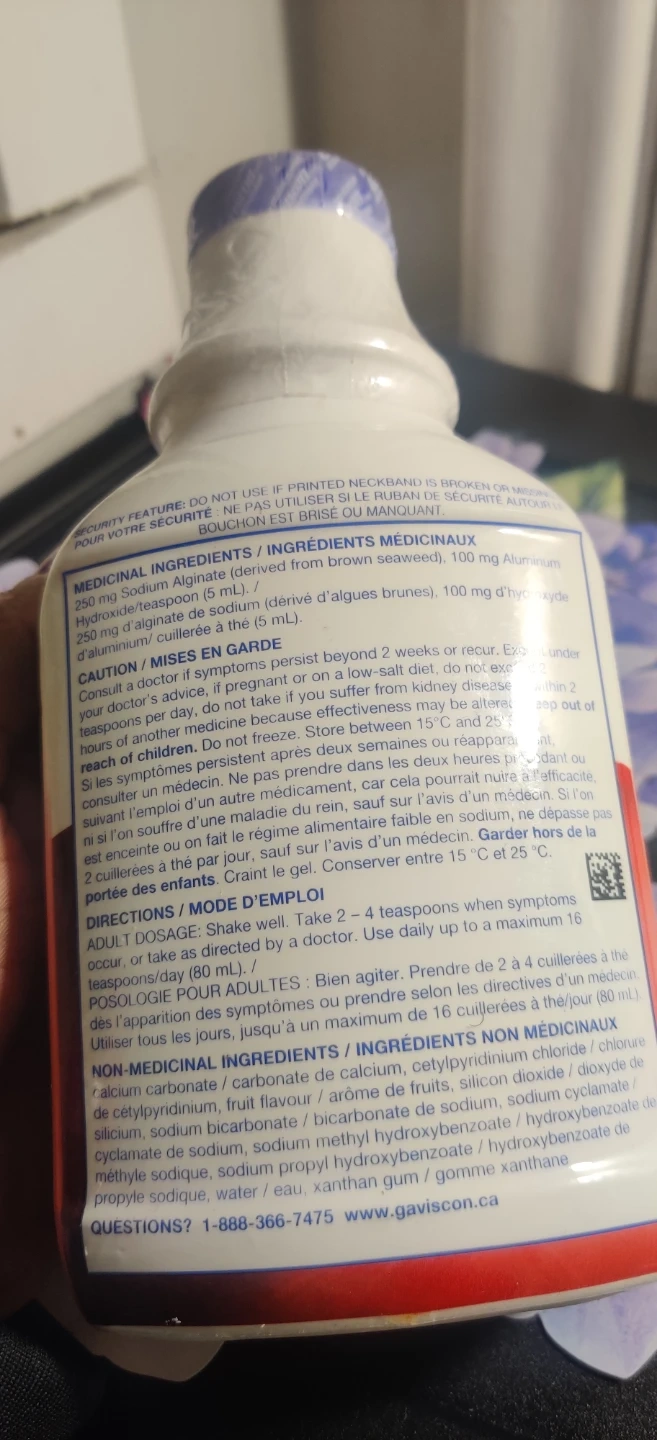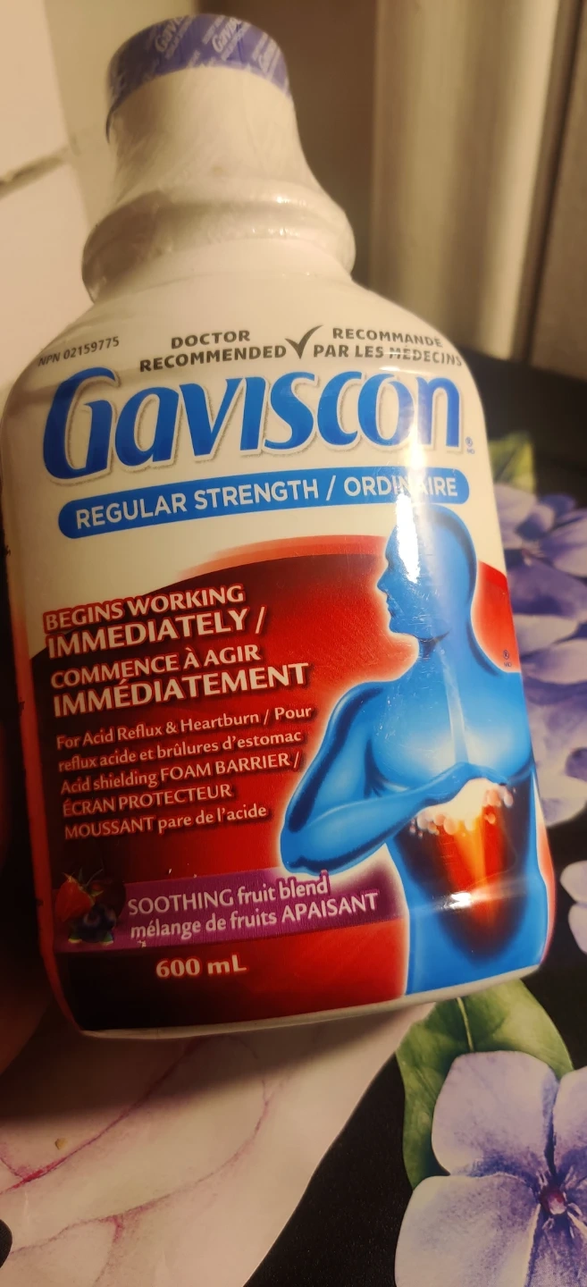 Gaviscon Regular Strength liquid provides fast relief for acid reflux and heartburn. It's a soothing fruit blend that begins working immediately. Expiration date is July 2027.