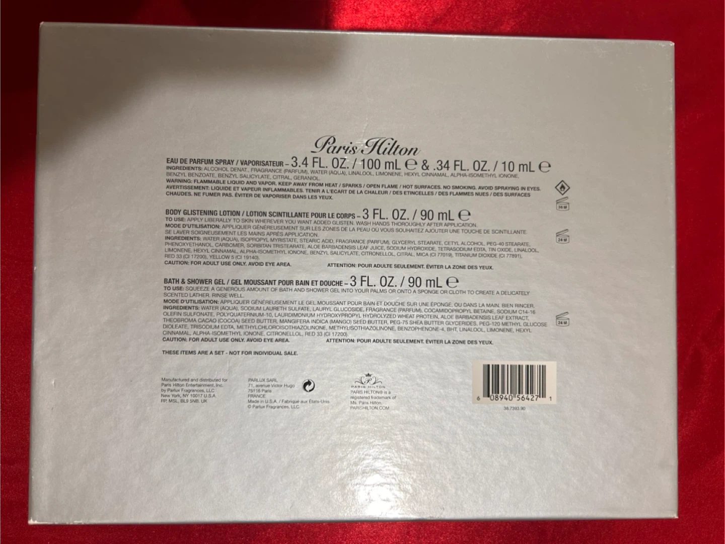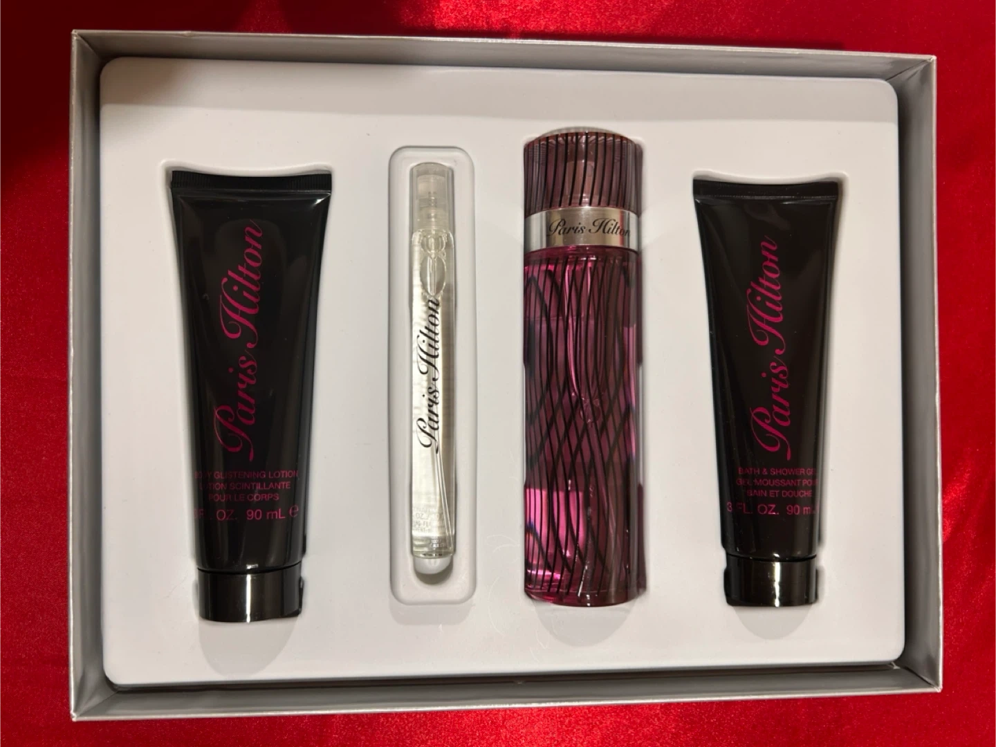 This Paris Hilton gift set includes an eau de parfum spray, travel size spray, body lotion, and body wash. The box has some dents, scratches, and stains.