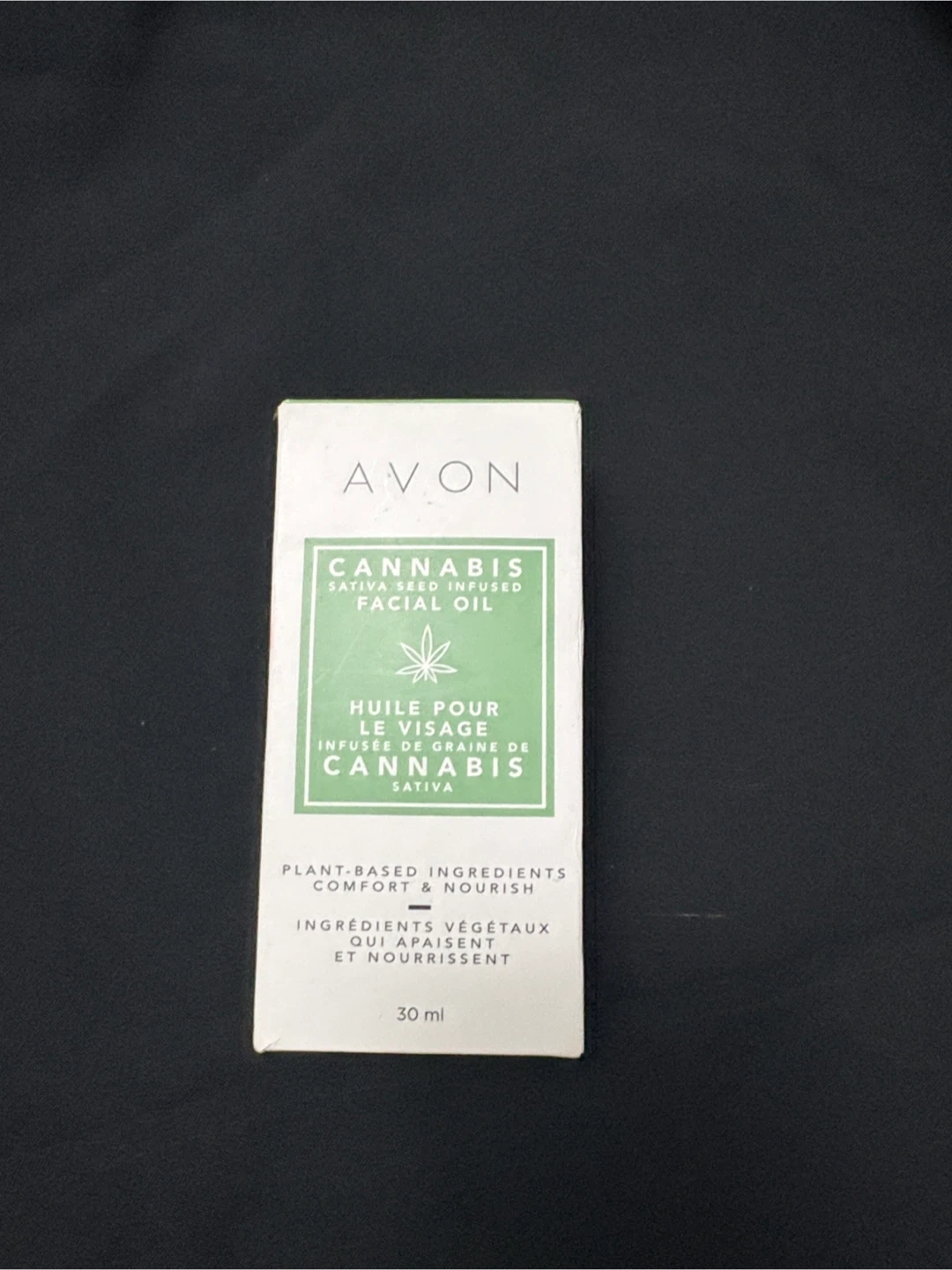 This is Avon Cannabis Sativa Seed Infused Facial Oil. It's made with plant-based ingredients. This oil is 30 ml.