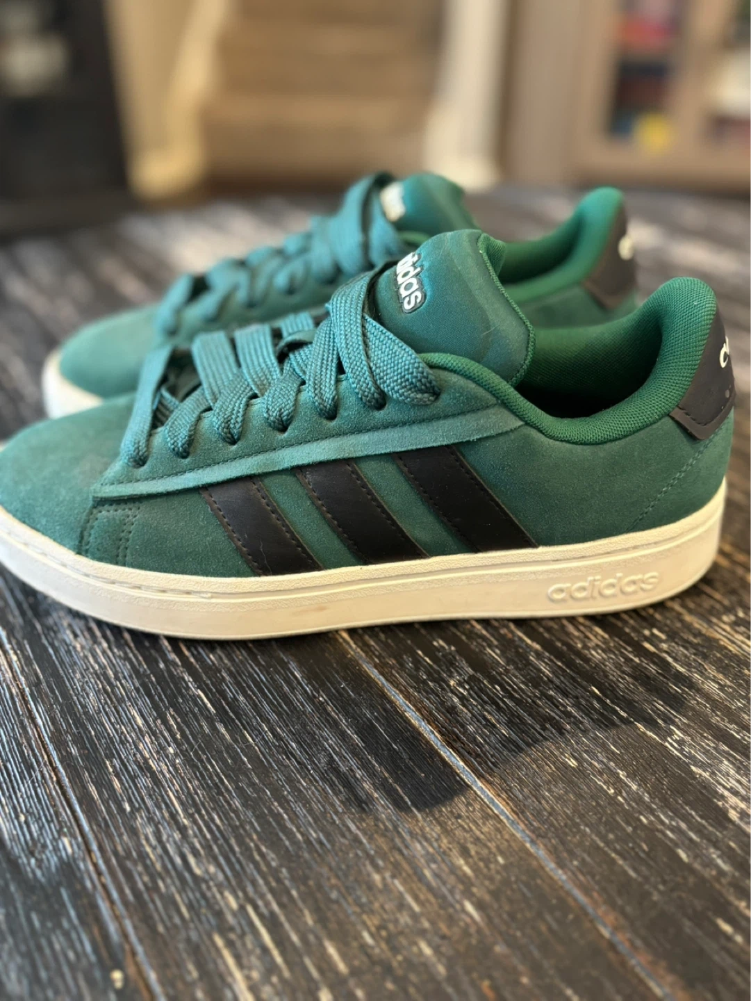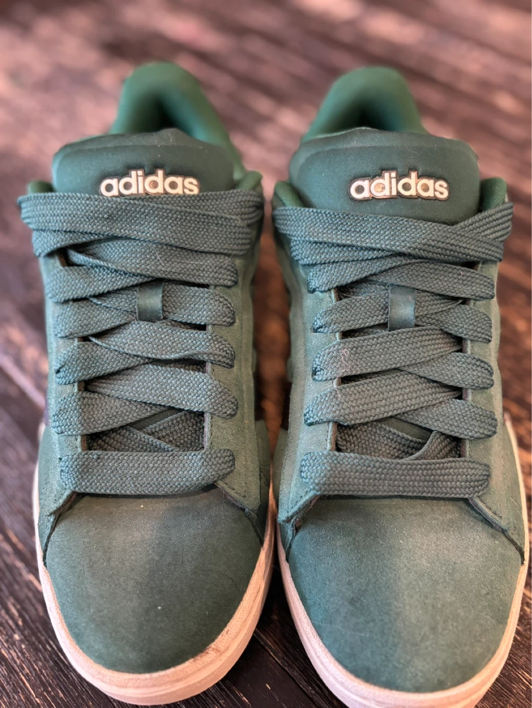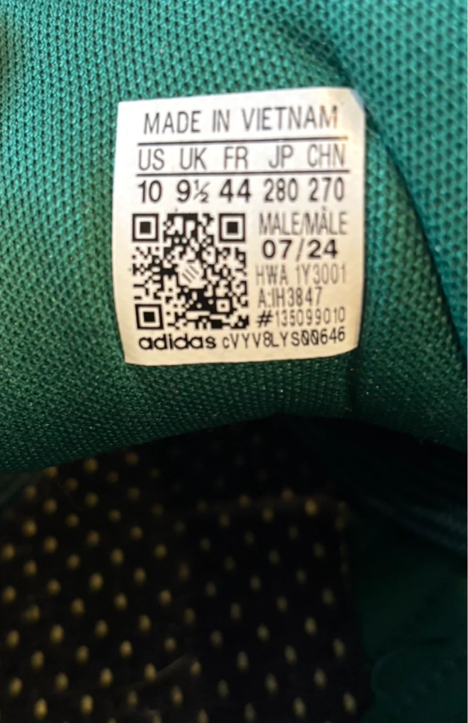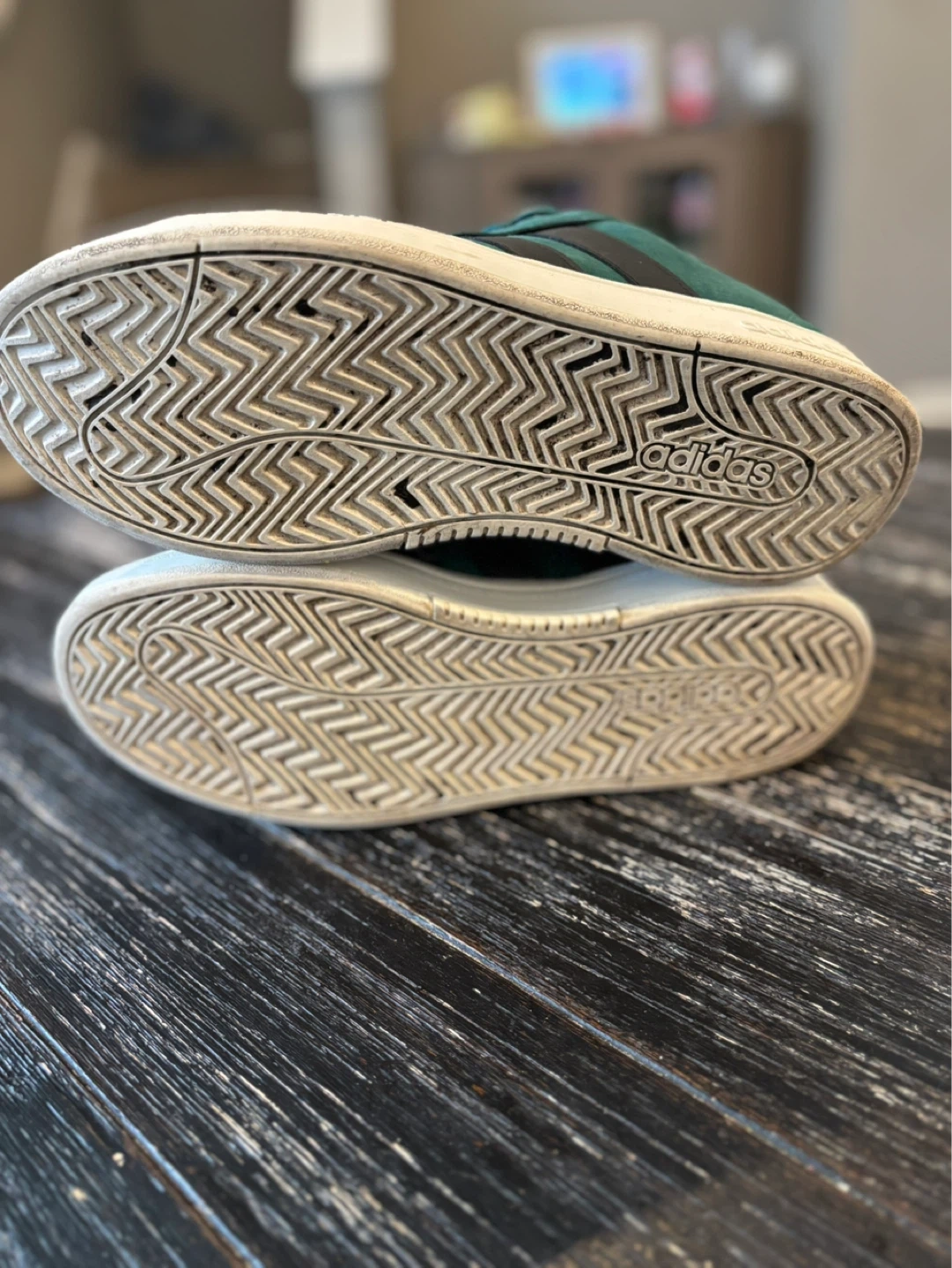 Adidas men's sneakers in a deep green color. US size 10, UK 9.5, EU 44, JP 280, CHN 270. Made in Vietnam. These are athletic shoes with a classic Adidas design. They have the iconic three stripes and a durable rubber sole.