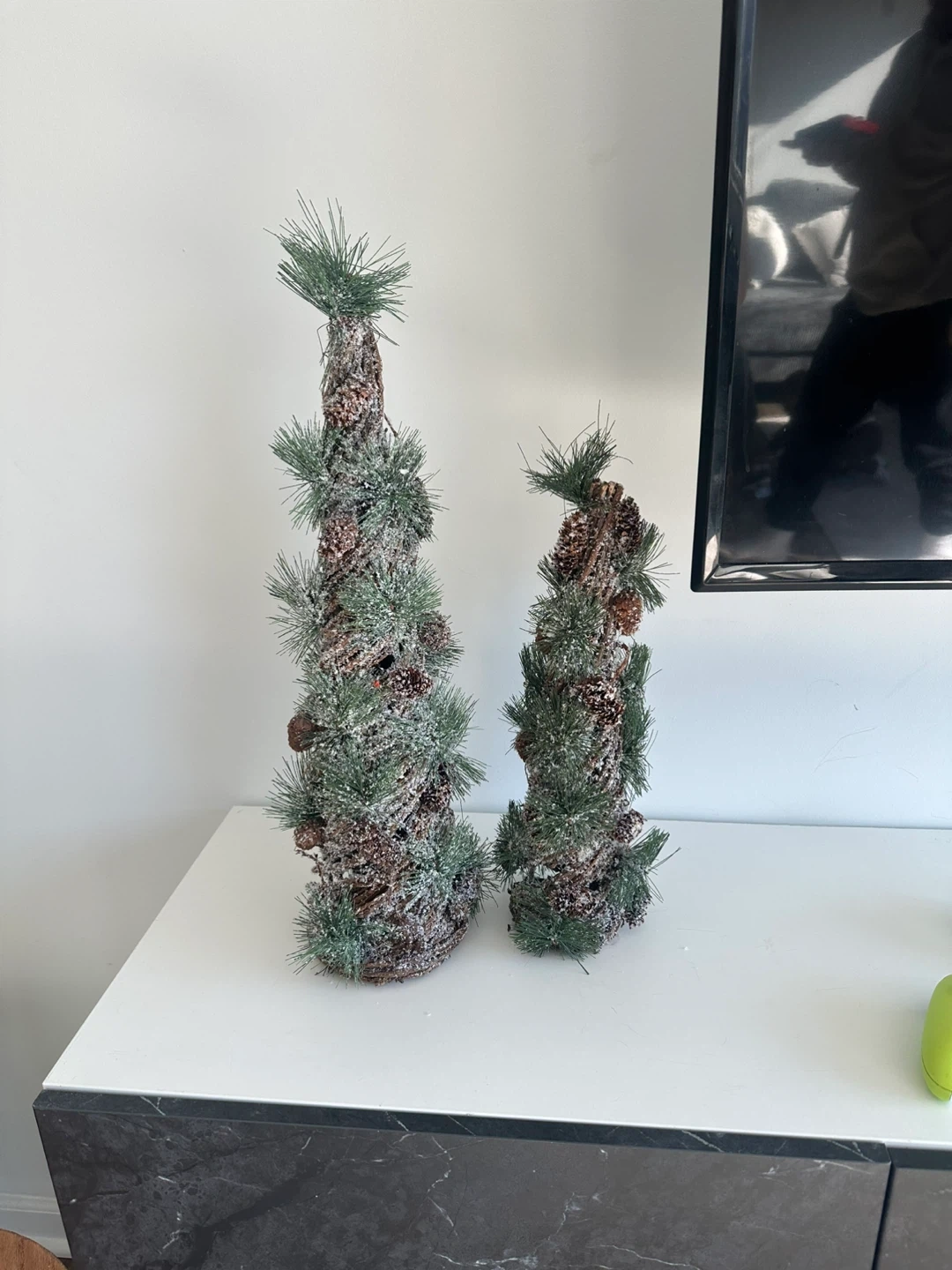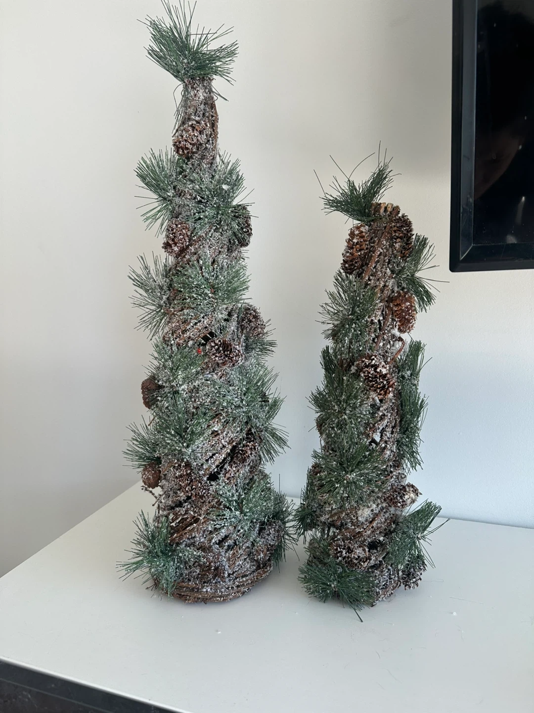 This pair of decorative Christmas trees adds a festive touch to any space. Each tree is crafted to resemble a pine cone and adorned with artificial pine needles and pinecones, finished with a snowy flocking. They're perfect for tabletop displays or as part of a larger holiday scene!