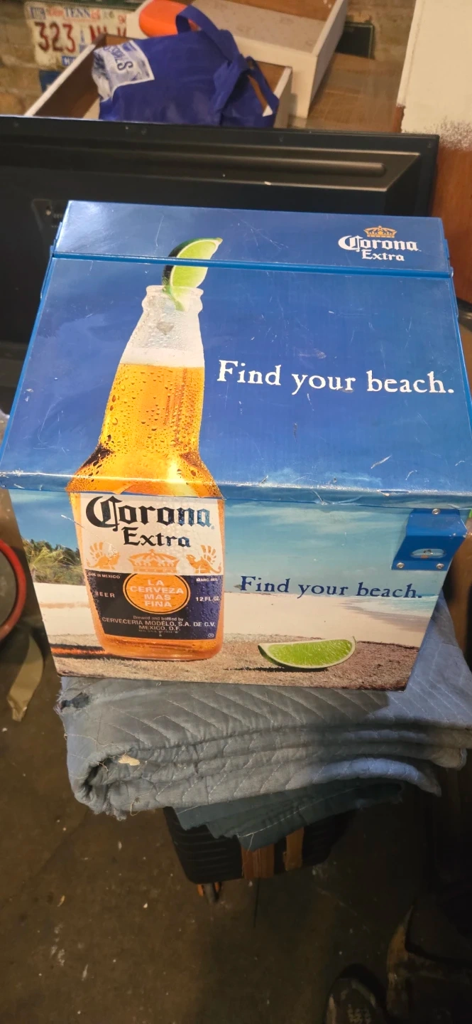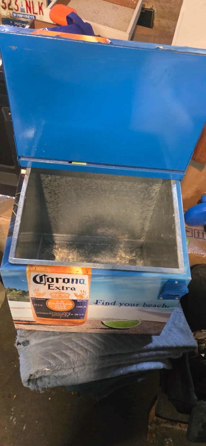 This Corona Extra metal cooler features the brand's iconic "Find your beach" slogan and bottle imagery. It's a great way to keep drinks cold outdoors. Made of durable metal with a blue interior and exterior.