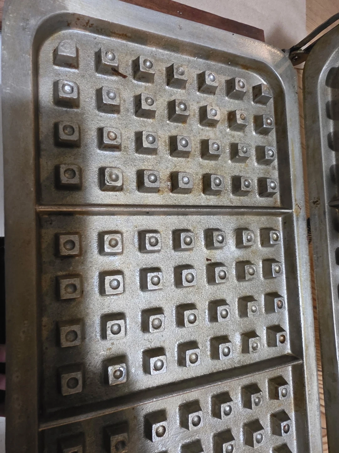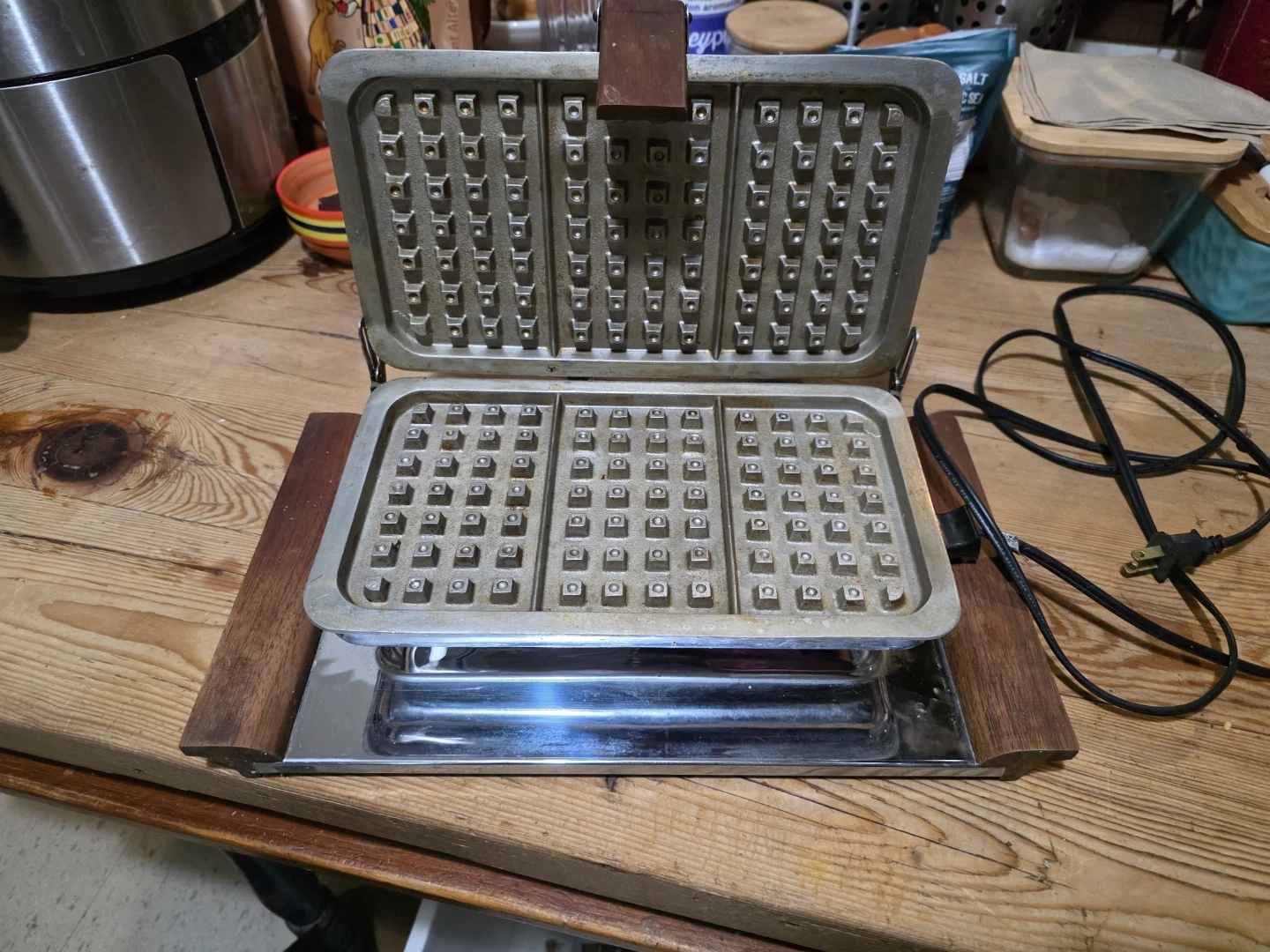This is a vintage chrome waffle maker with a wooden base and handle. It has a built-in thermometer. It's great for making homemade waffles! Works!
