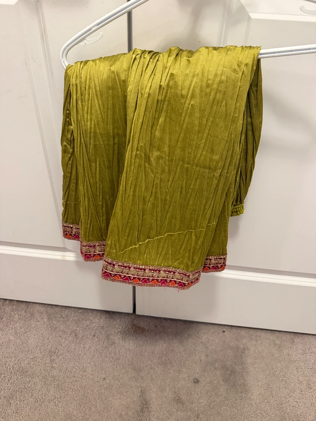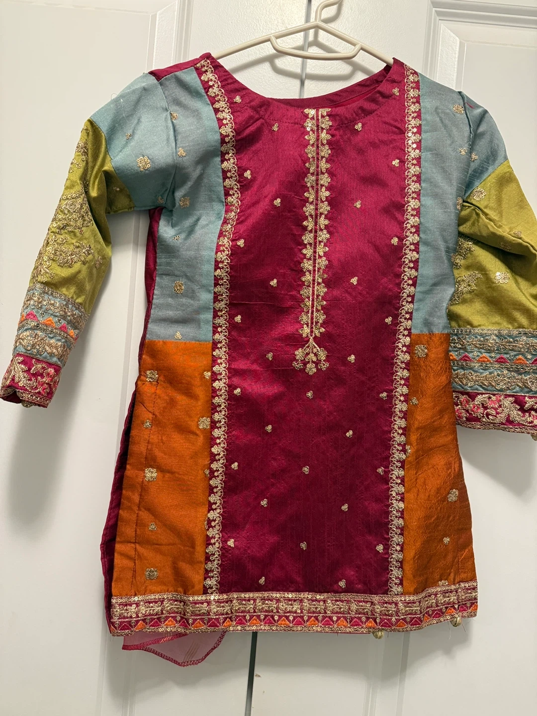 This is a lovely embroidered kurti and matching pants set for girls. It's made from a silky fabric with intricate gold thread and bead embellishments. The top features a colourful patchwork design with a plum centre, teal and lime green sleeves, and an orange panel. The pants are a crushed olive green with embroidered cuffs. Perfect for special occasions!