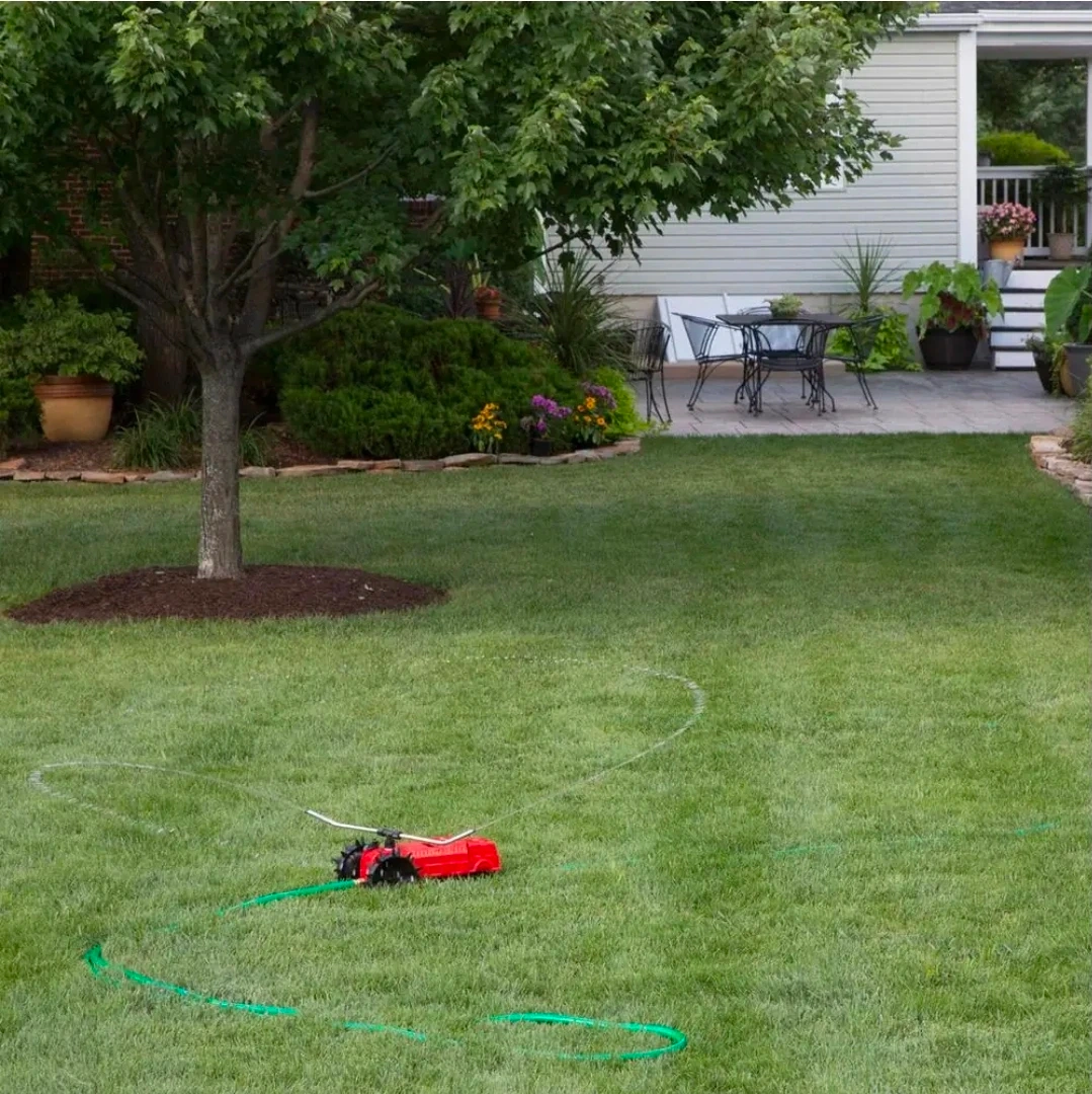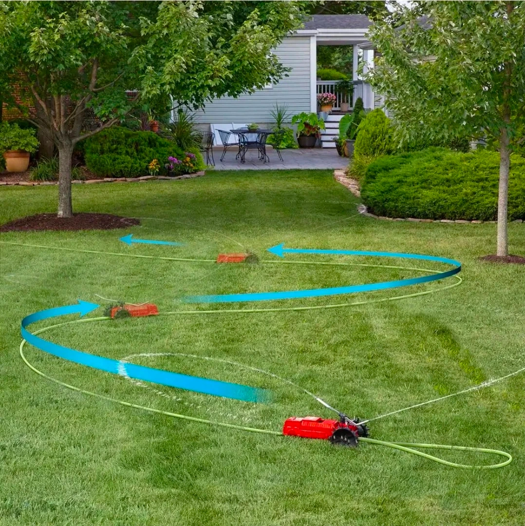 It's designed to travel along your hose, watering as it goes. Features adjustable spray patterns and distance.
