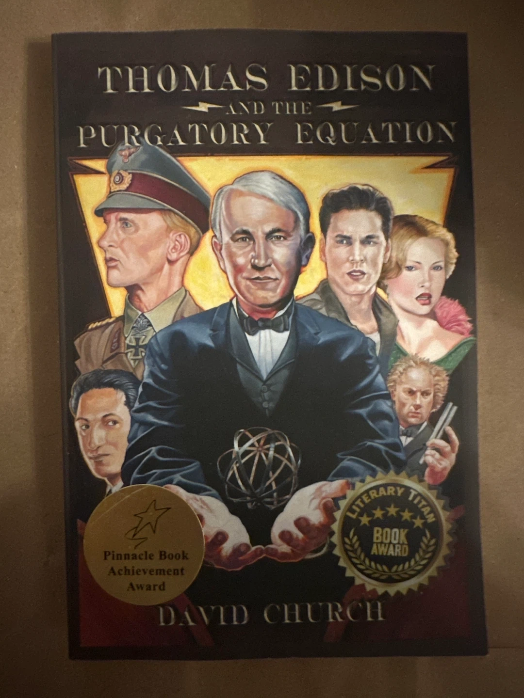This is Thomas Edison and the Purgatory Equation by David Church. It's a novel with a Pinnacle Book Achievement Award and Literary Titan Book Award. The book tells a story featuring Thomas Edison.