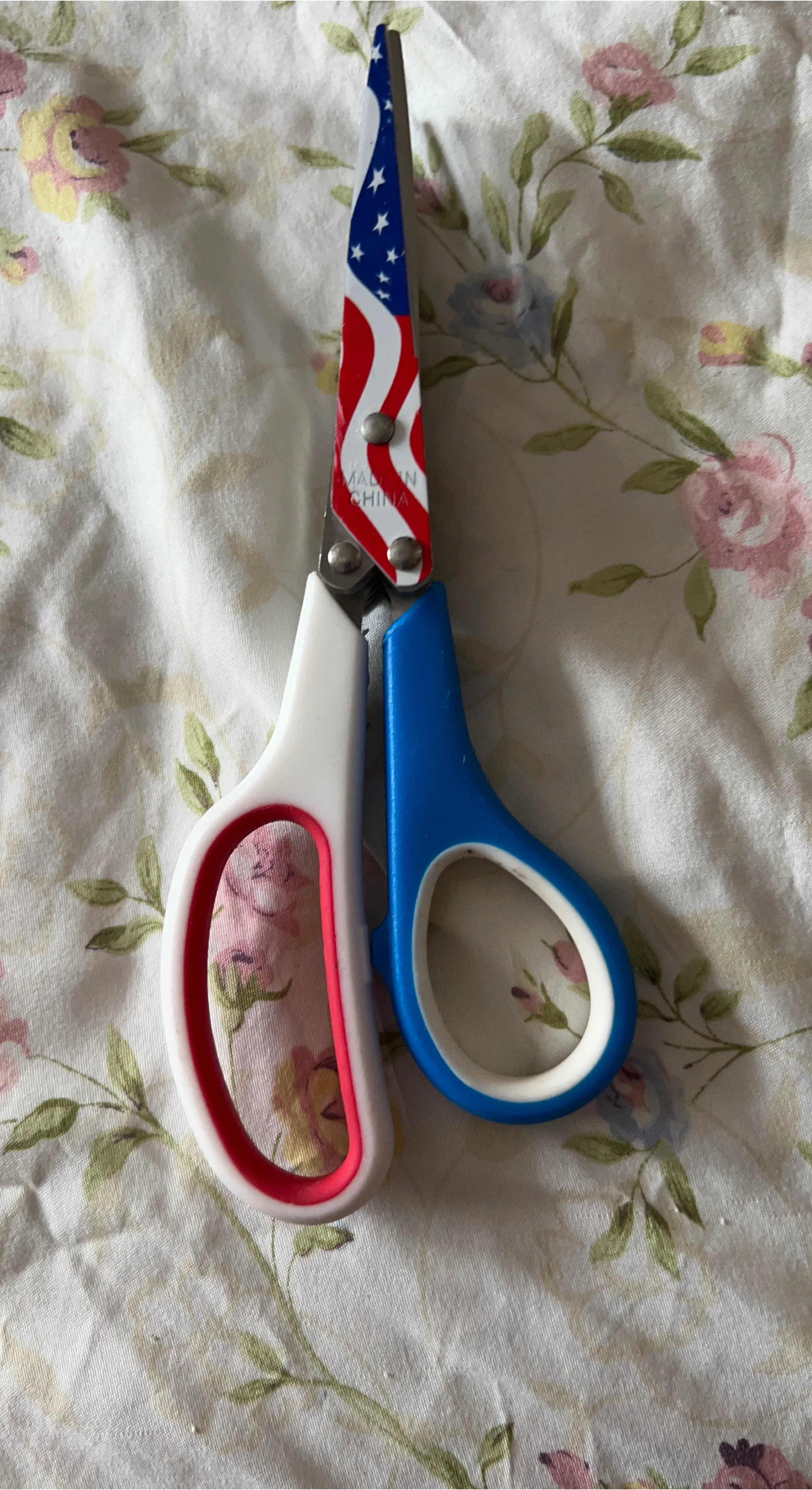 These scissors feature a fun American flag design on the blades. They have comfortable red and blue plastic handles. Made in China.