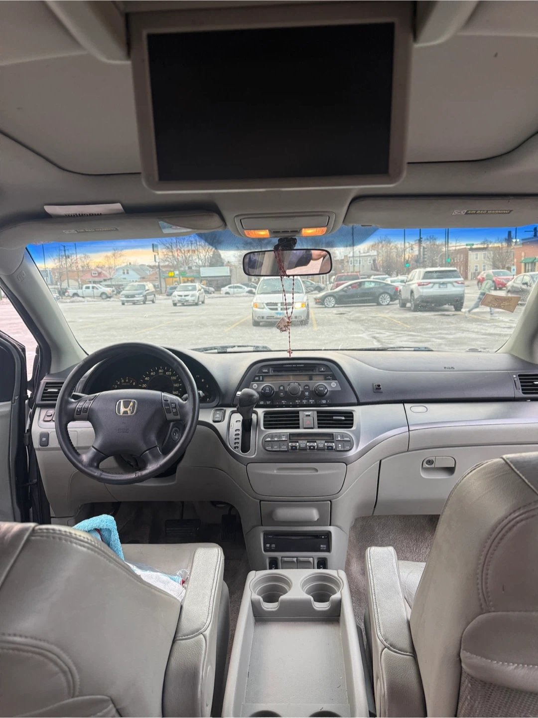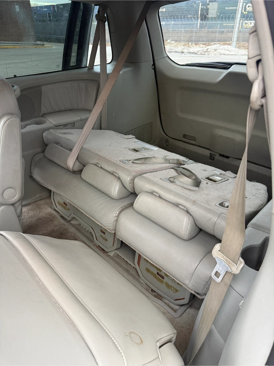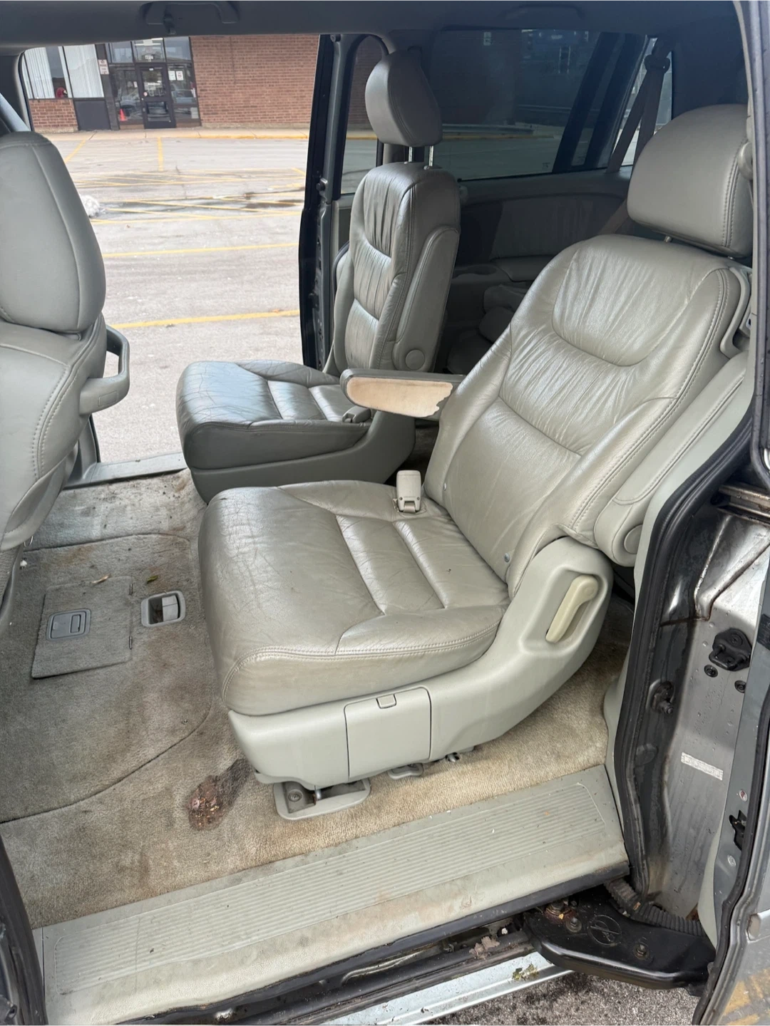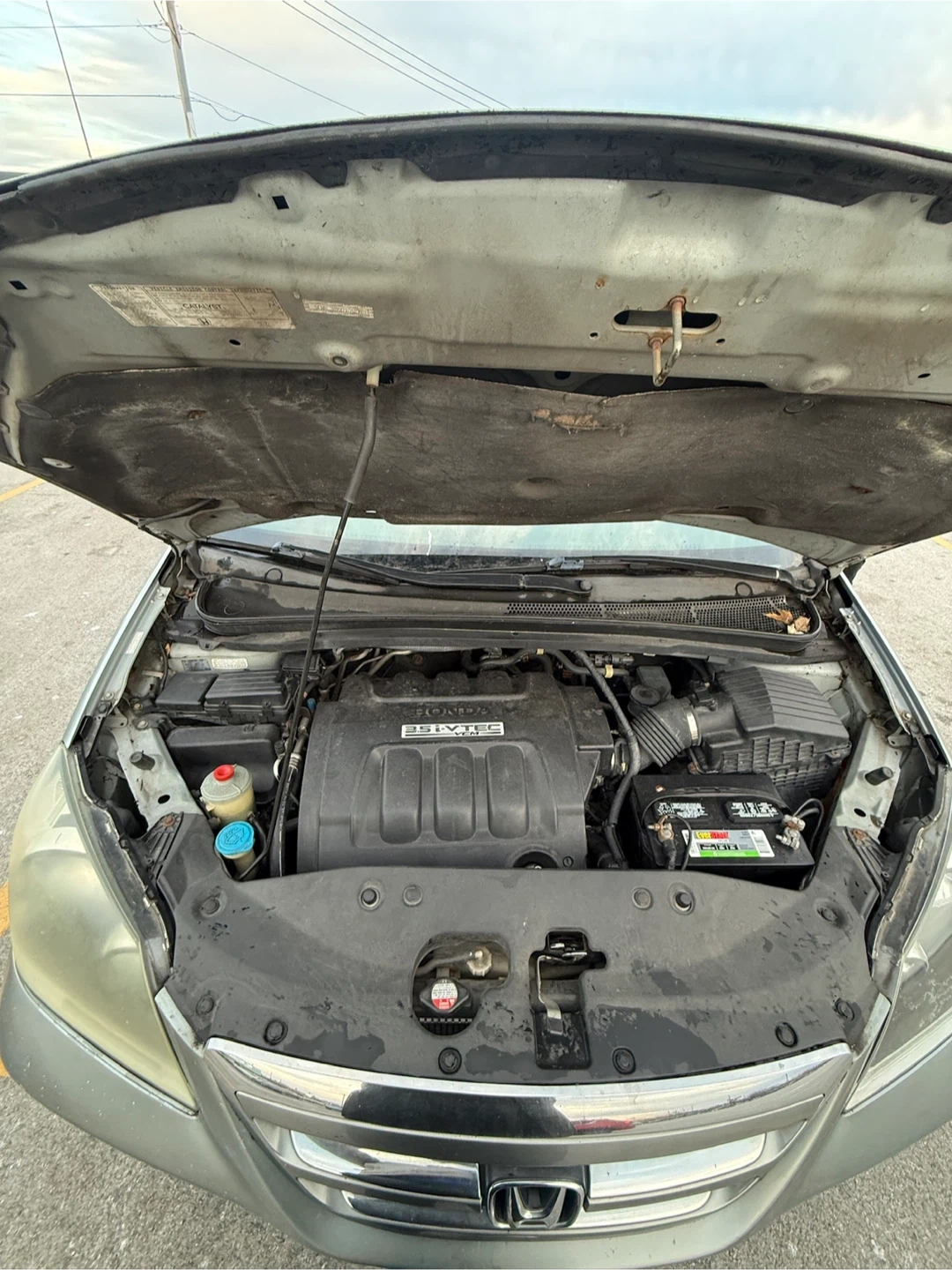 This is a silver Honda Odyssey minivan. It's a 2008 model. It has a 3.5L V6 engine. The third-row seating is folded down for extra cargo space. 3,200 or best offer