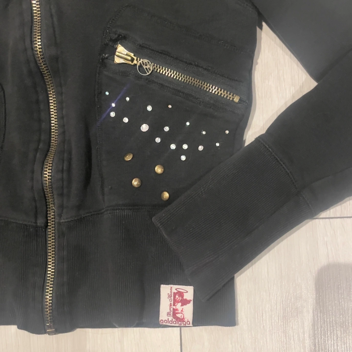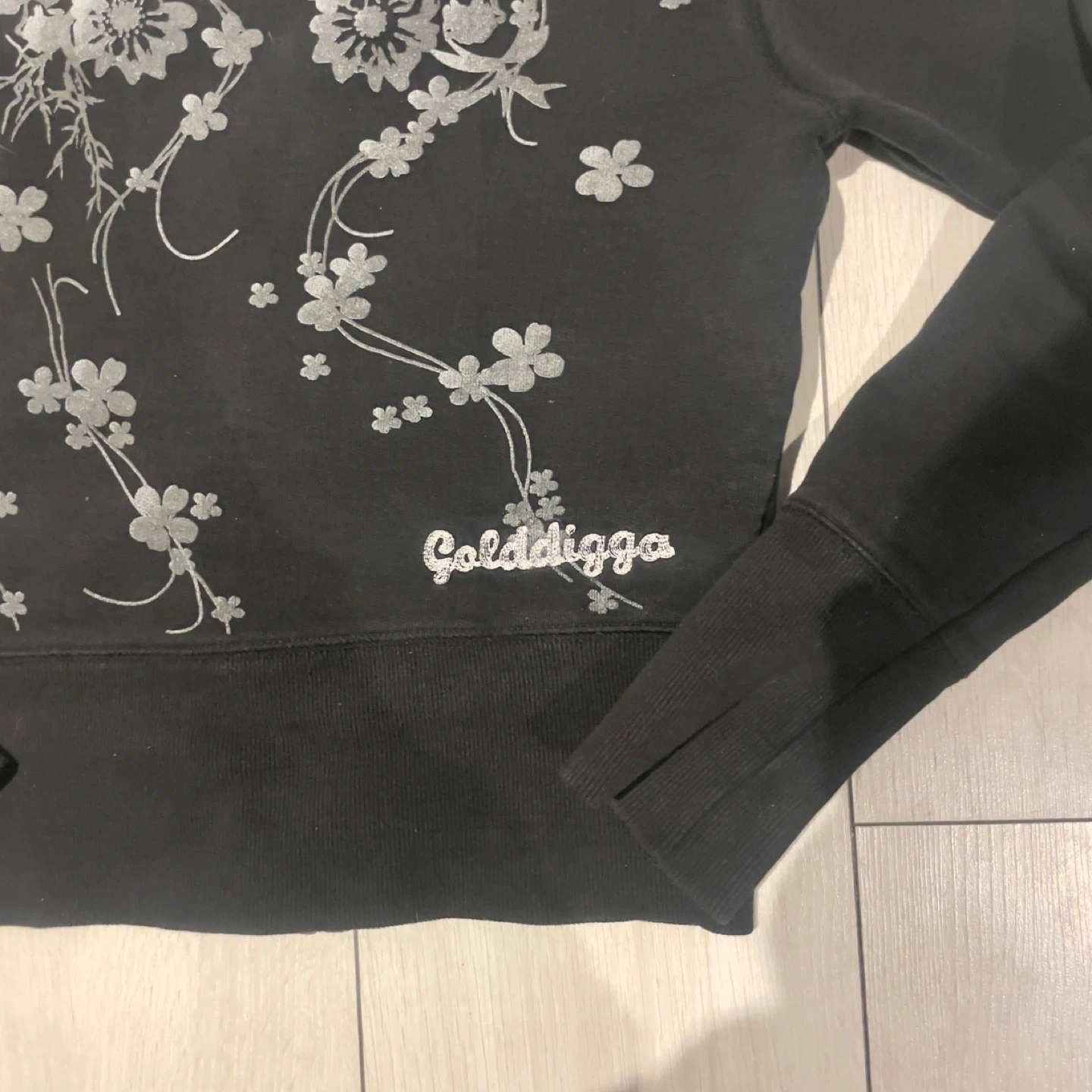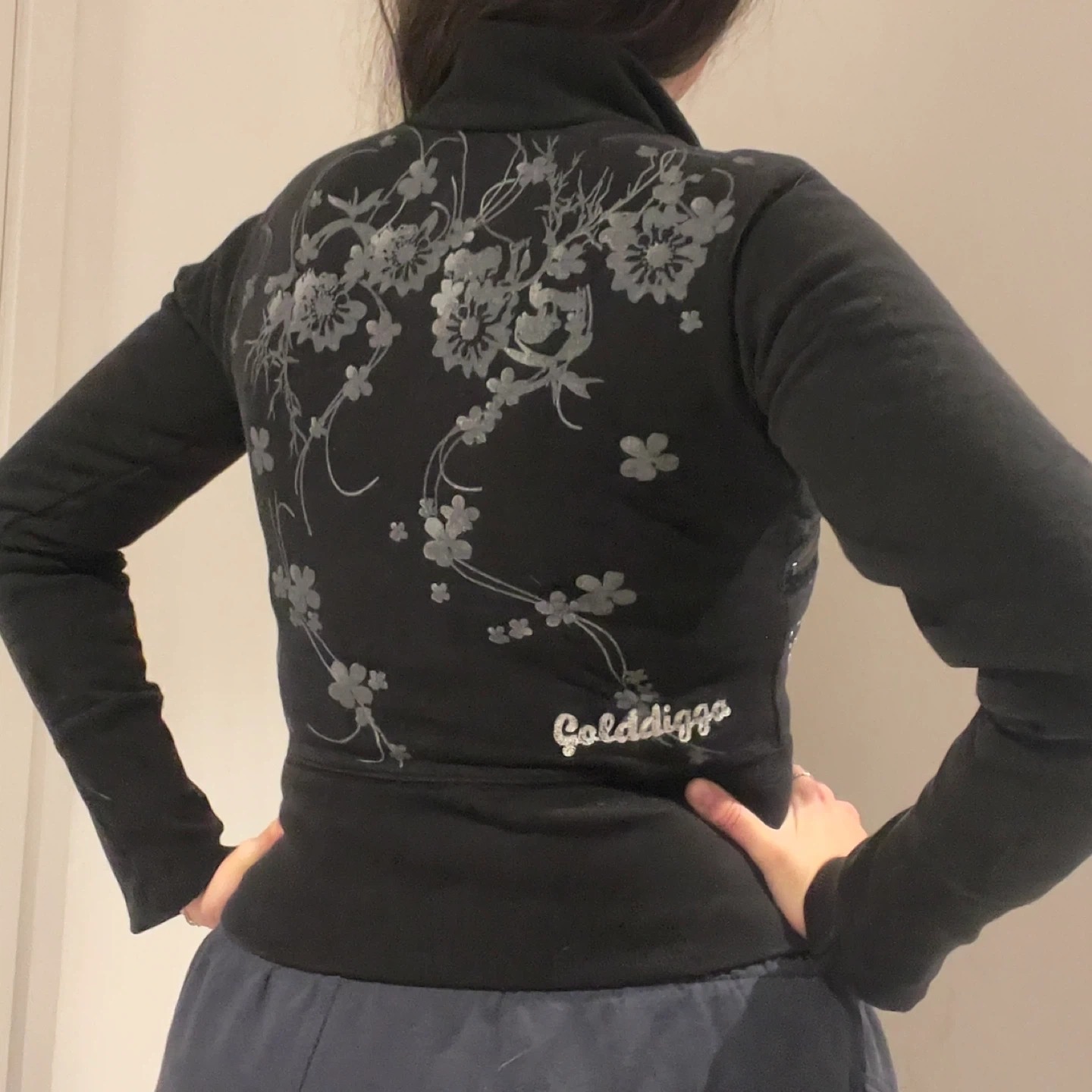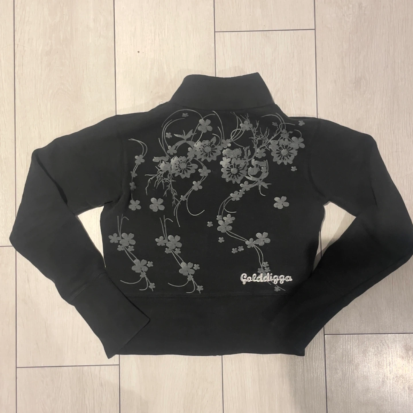 Selling a cute Golddigga zip-up jacket in black. It features a lovely floral design on the back and some stylish details like small zippers and embellishments on the front. Size is S. 100% cotton.
