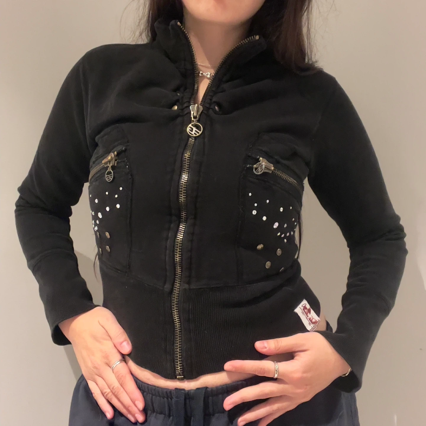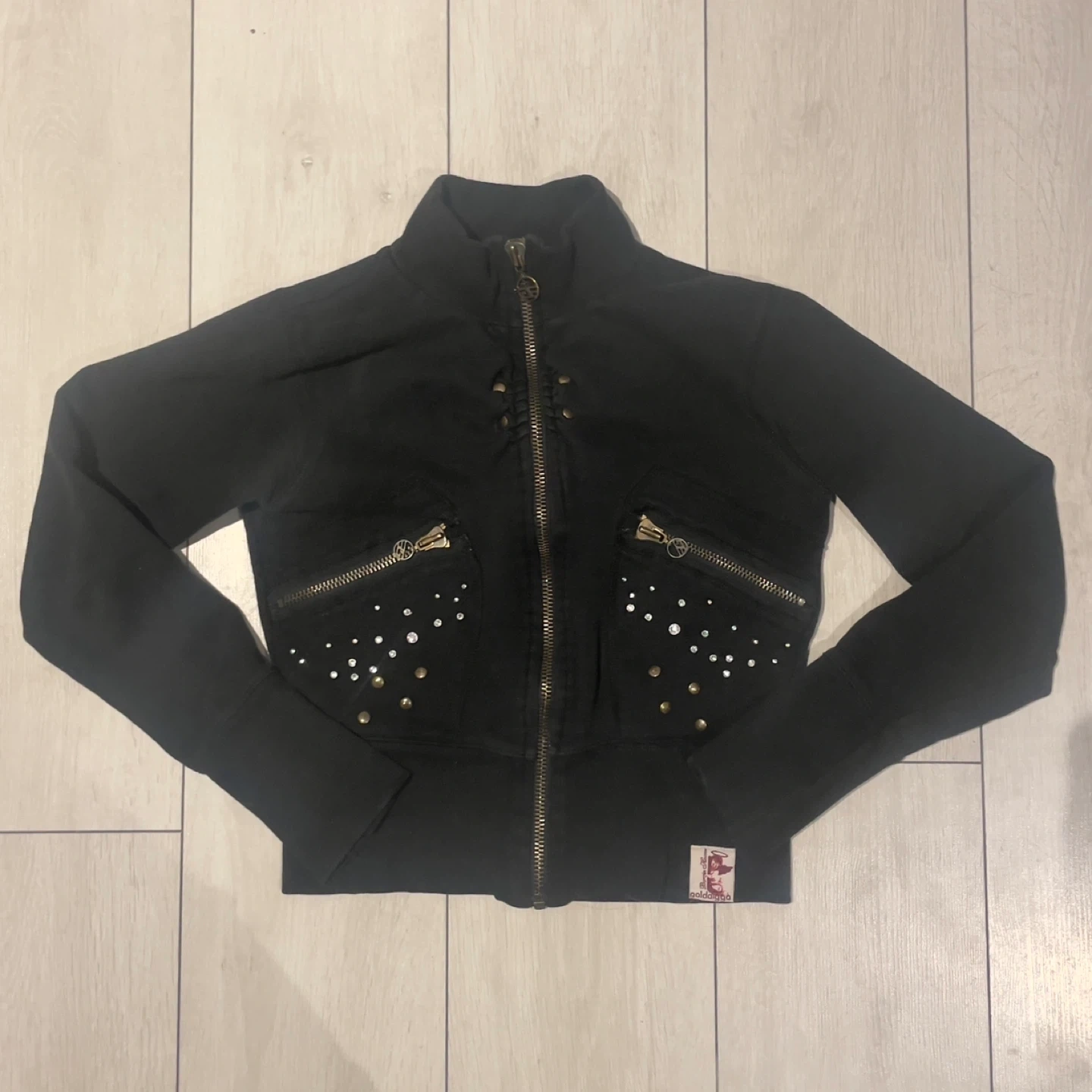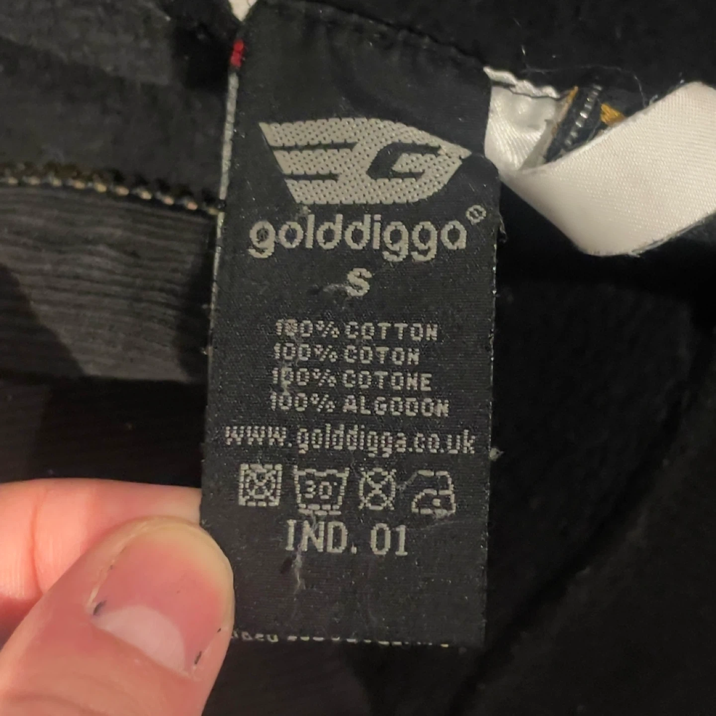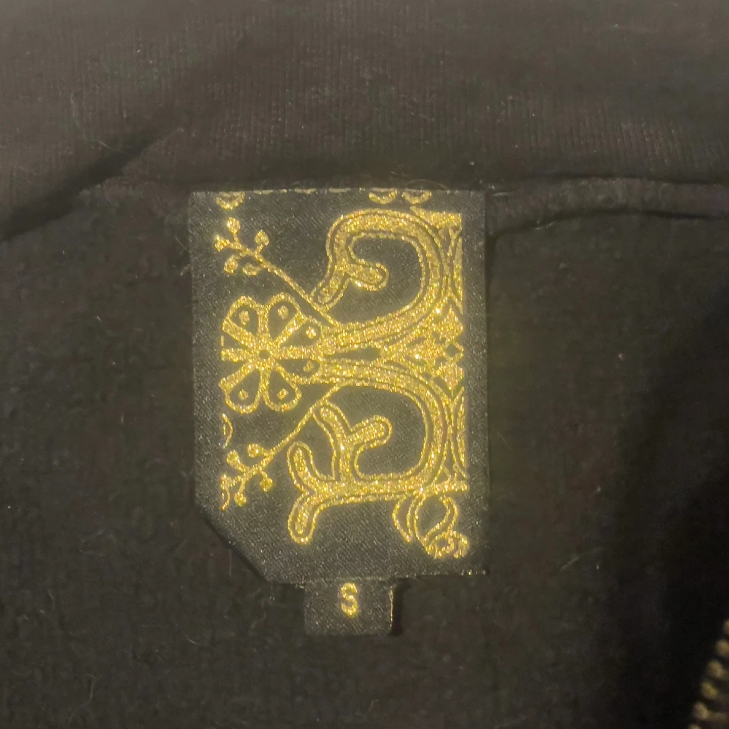 Selling a cute Golddigga zip-up jacket in black. It features a lovely floral design on the back and some stylish details like small zippers and embellishments on the front. Size is S. 100% cotton.