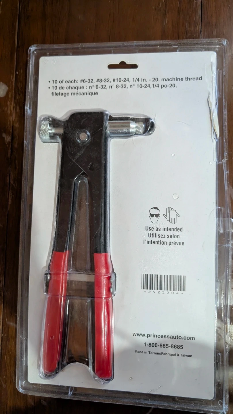 This is a 45-piece kit that includes a riveting tool and various threaded inserts. The kit contains 10 of each: #6-32, #8-32, #10-24, and 1/4 in. machine thread inserts. It's made in Taiwan. This tool is useful for securely fastening materials together.