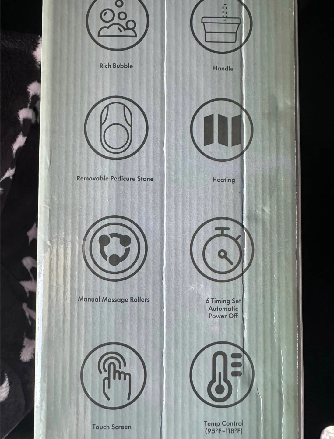Foot spa massager. Features include heat, massage rollers, invigorating bubbles, and a removable pedicure stone. Six timer settings and temperature control. Collapsible design for easy storage.