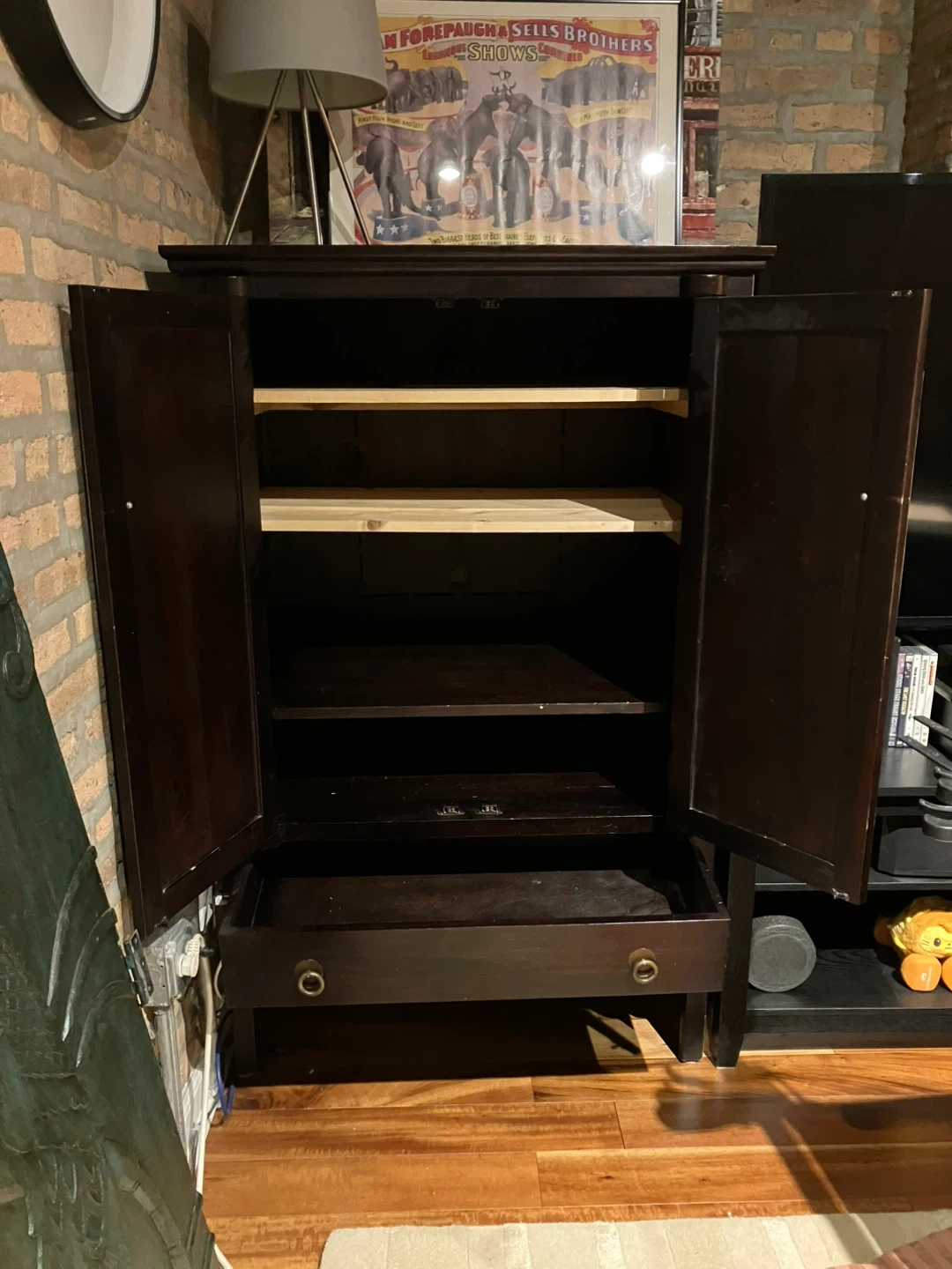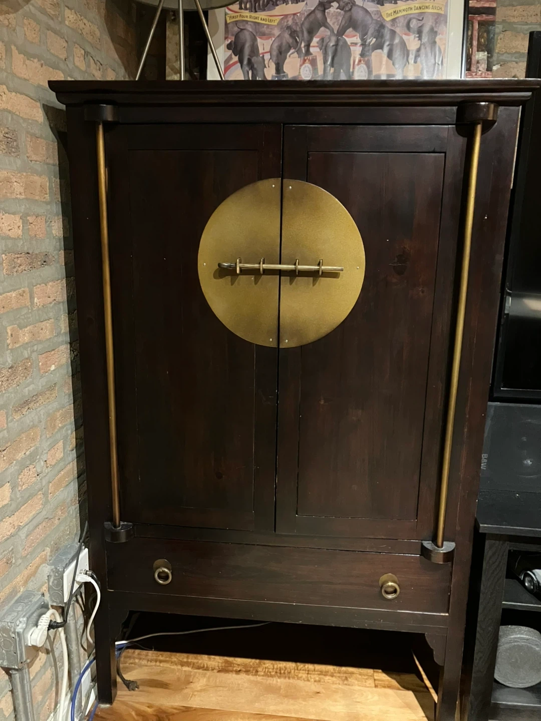 This dark wood cabinet, armoire cupboard features striking brass hardware, including a large circular pull on the double doors and smaller pulls on the drawer. It offers ample storage with multiple shelves inside and a drawer at the bottom. They don’t make cabinets like they used to this is a sturdy well made one. The interior is also dark wood. Has 2 added shelves for storage as seen in picture. Cash and pick up only. This cabinet is heavy bring help.