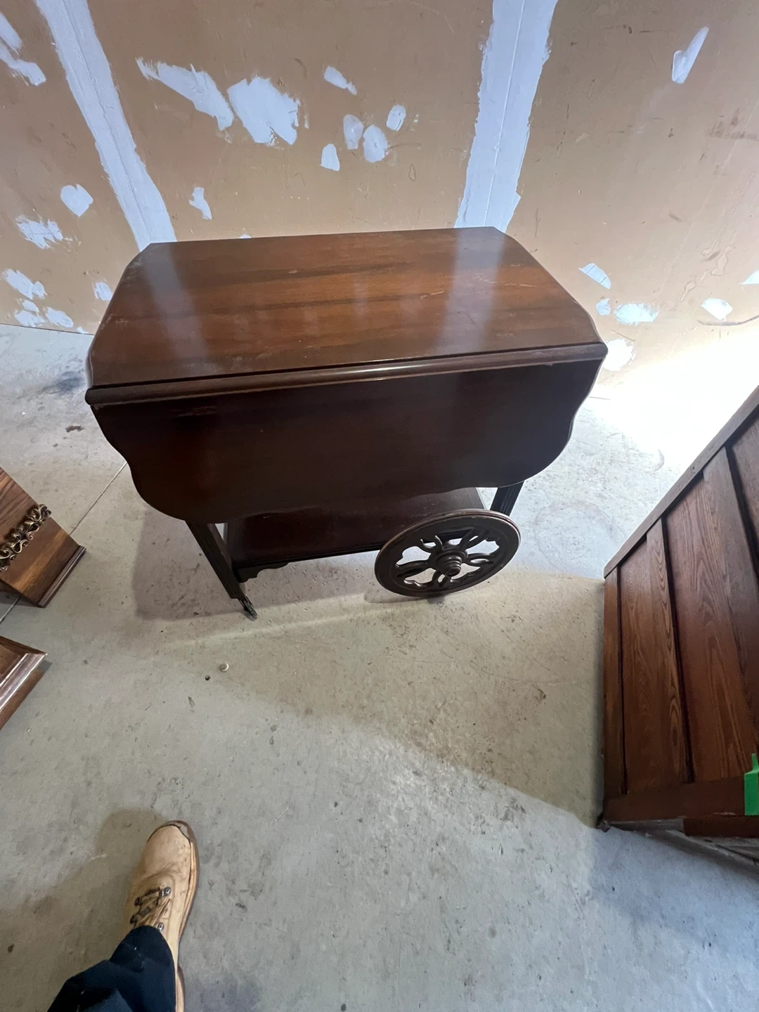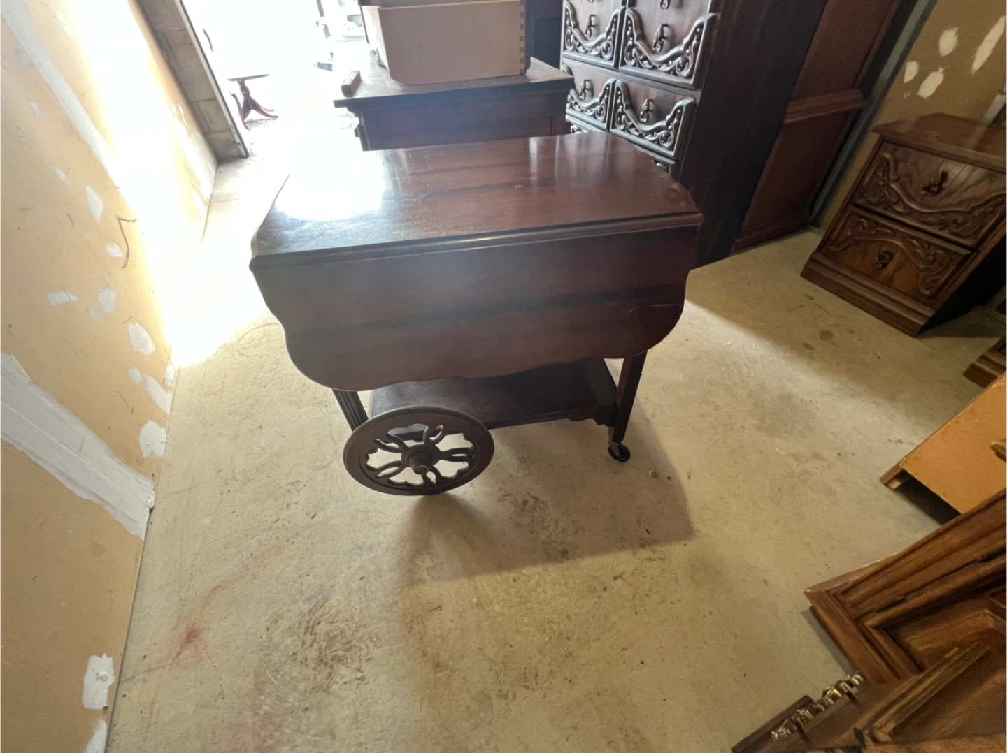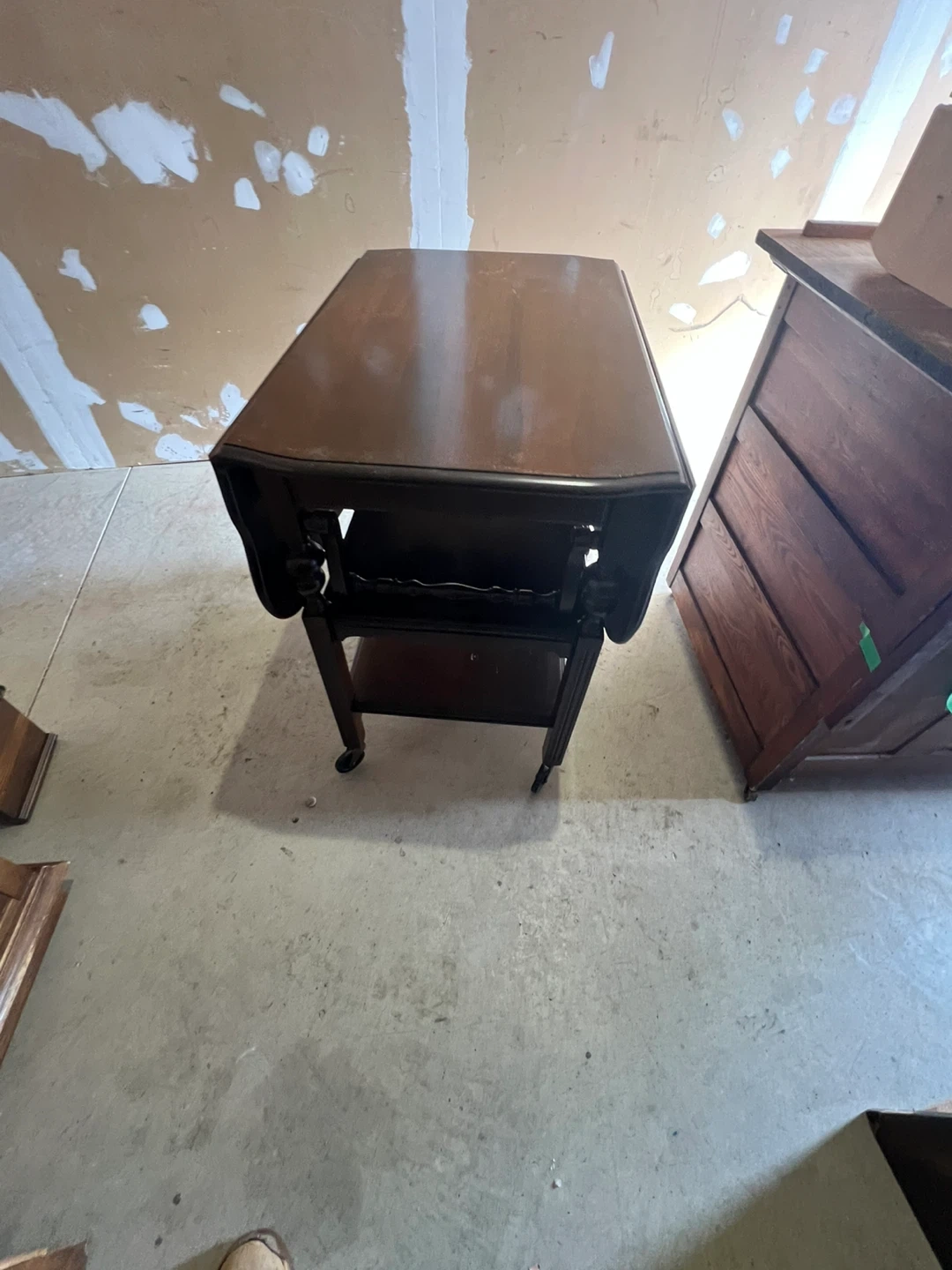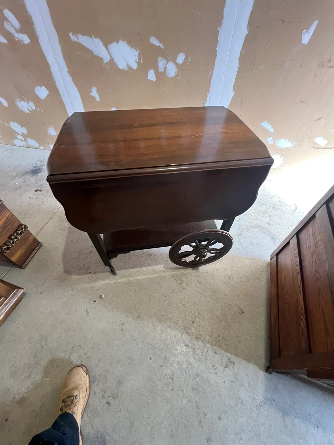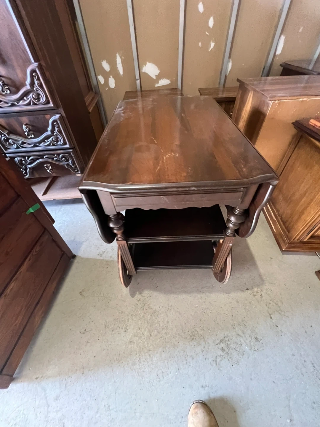 120$ 19 inch by 29 inch 30 inch high This is a used antique charming wooden drop leaf serving cart, perfect for use as a bar cart or extra surface space. It features two tiers for storage and wheels for easy mobility. The rich wood finish complements many decor styles. It's great for entertaining or everyday convenience! Delivery Pricing: • Scarborough: Free • Downtown Toronto, North York ,EastYork , Markham , Pickering : $20 • Vaughan, Etobicoke, Stouffville, Mississauga, Ajax, Richmond Hill : $30 • Oshawa, Aurora, Whitby, Brampton : $40 • King City, Newmarket, Courtice. : $50 • East Gwillimbury : 60$ • Bowmanville, Clarington, Oakville, Milton, Bradford West Gwillimbury : $70 • Burlington, Port Perry, Uxbridge : $80 Important Notes: • We may deliver to areas outside the list; delivery may cost more than the furniture in such cases. • Night-shift delivery available for customers who work during the day. • All items are exactly as shown in pictures and videos. • Deliveries are made to the front of your building or house • No holds — we operate on a day-by-day basis. • Bookings will NOT be confirmed without an exact delivery address and a valid phone number. No exceptions. Explore Our Furniture Collection New & Used Furniture: Facebook: https://www.facebook.com/kfurnitures?mibextid=kFxxJD Instagram: https://www.instagram.com/karout_furniture?igsh=NmxkZGlnNjRsNGdi&utm_source=qr For Antiques , art & decoration : Facebook page: https://www.facebook.com/profile.php?id=61559717161604&mibextid=LQQJ4d Instagram: https://www.instagram.com/karout.antique?igsh=MWl1dnNlZDh6Z2My Purchase New Furniture Online https://karoutmoving.ca/shop/ Cell: 647-391-8784 Moving & Delivery Services All furniture is delivered by Karout Moving & Delivery Website: www.karoutmoving.ca Cell: 647-740-8205