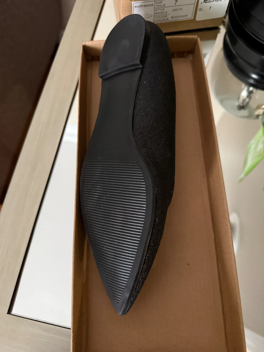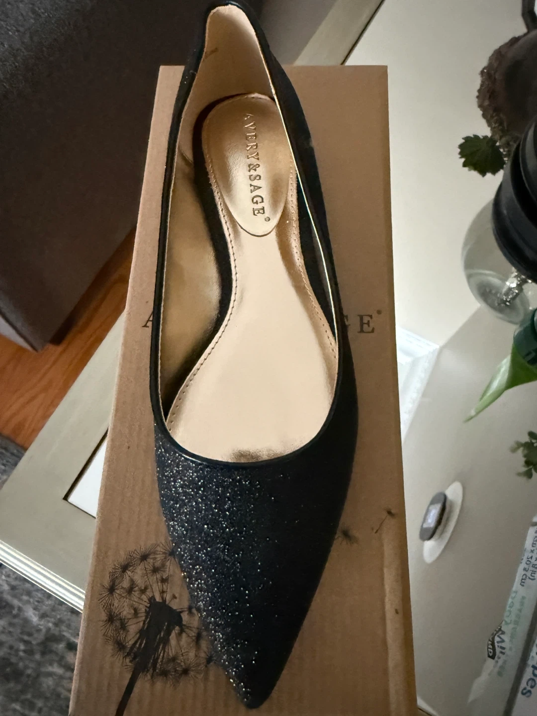 Sparkly black pointed-toe flats from Avery & Sage. These Odette style shoes are a size 7 and feature a glitter finish. They're great for adding a touch of shine to any outfit!