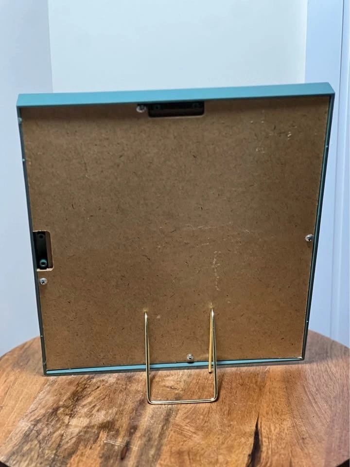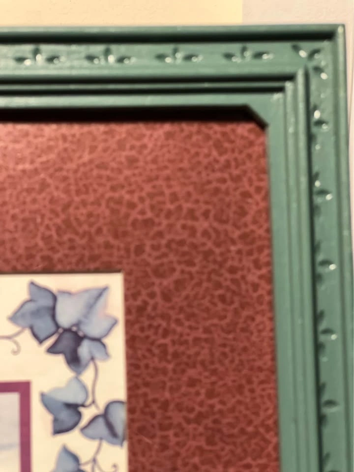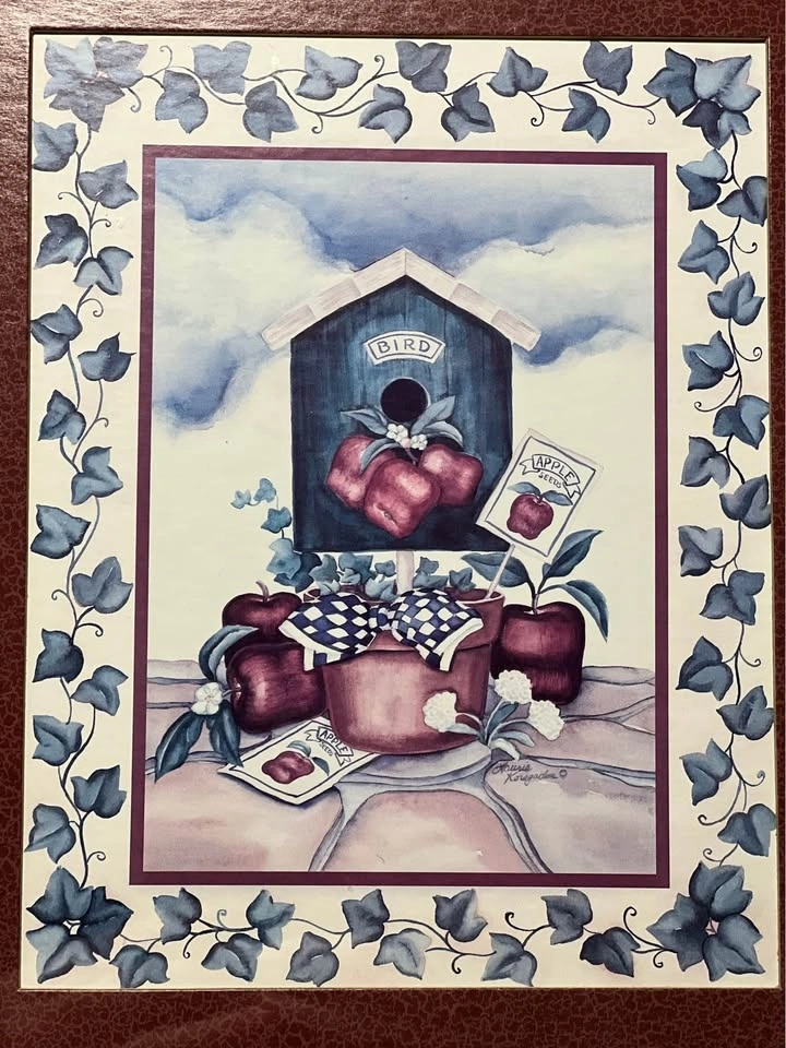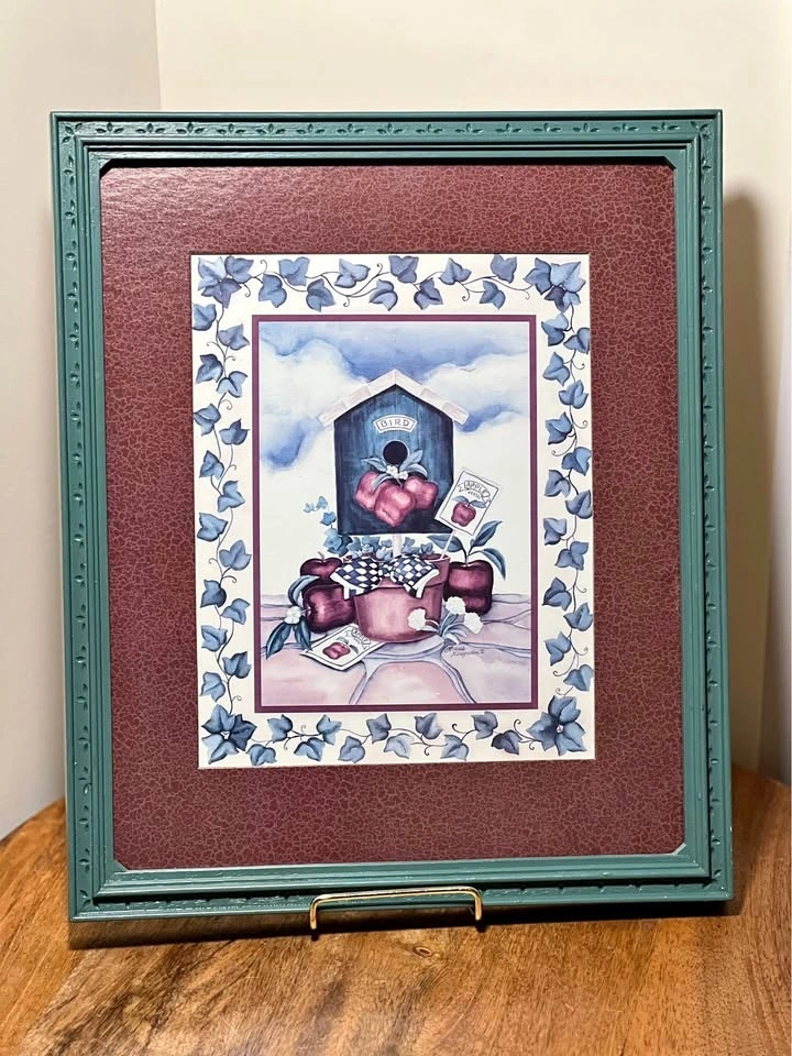 This framed art print features a folk-style birdhouse illustration and was part of a discontinued Home Interiors (often associated with Homco) collection. The piece depicts a birdhouse surrounded by apples and an ivy-patterned border. It measures approximately 13” x 11” framed, with a textured green frame and a deep burgundy or maroon mat. Pickup is at 58th and 7th Ave in midtown Manhattan.