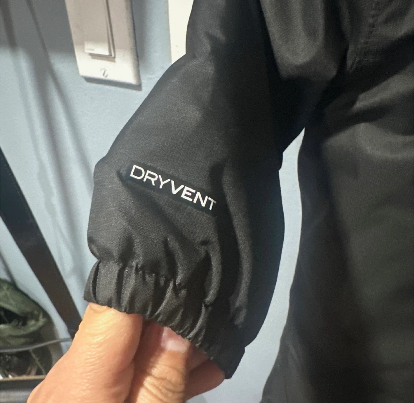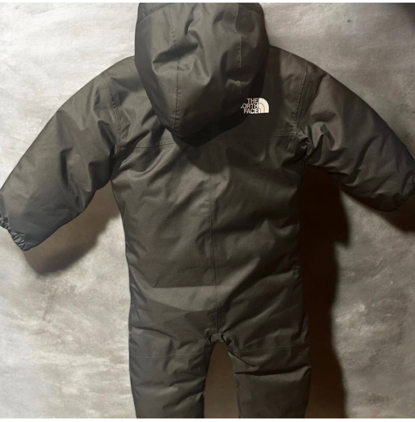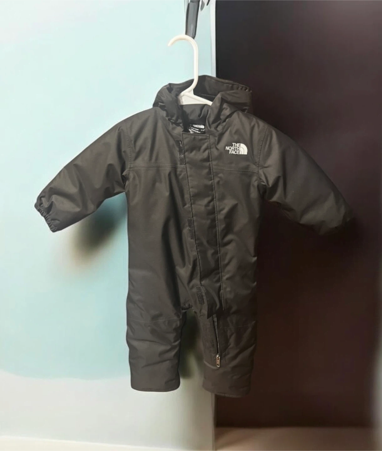 One-piece insulated snowsuit with attached hood. Full front zipper with storm flap. Water-resistant shell in solid black. Embroidered The North Face logo on chest. Worn couple times