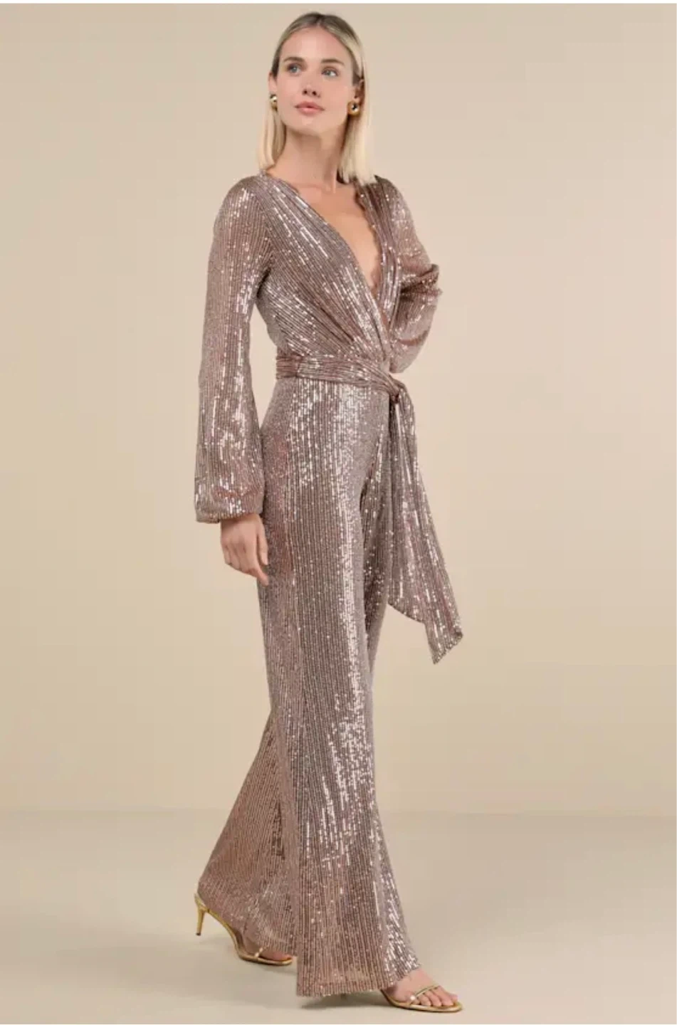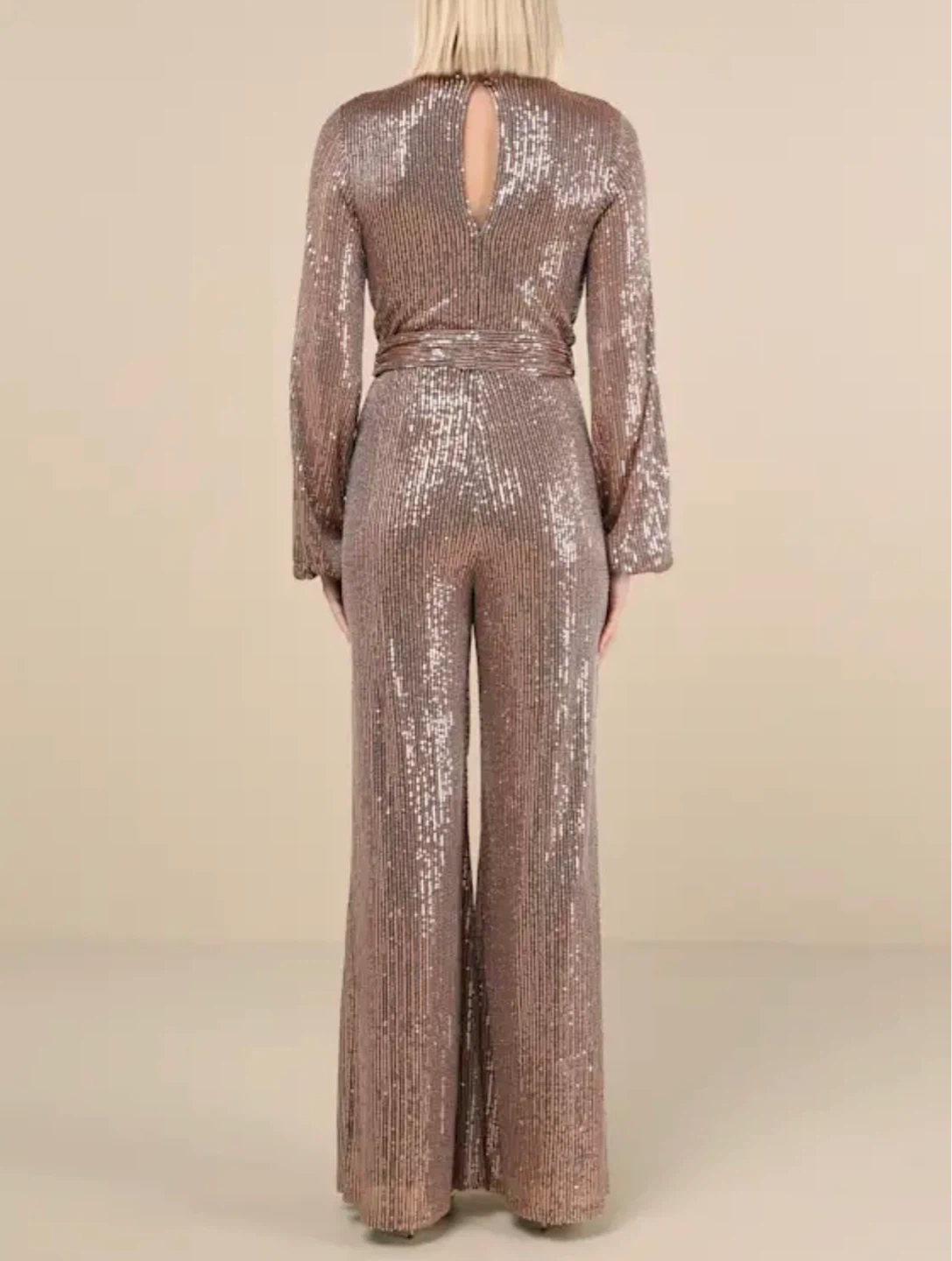 Sparkly rose gold sequin jumpsuit with a wrap V-neckline and long bell sleeves. It features a self-tie waist and a keyhole back closure. Wide leg silhouette.