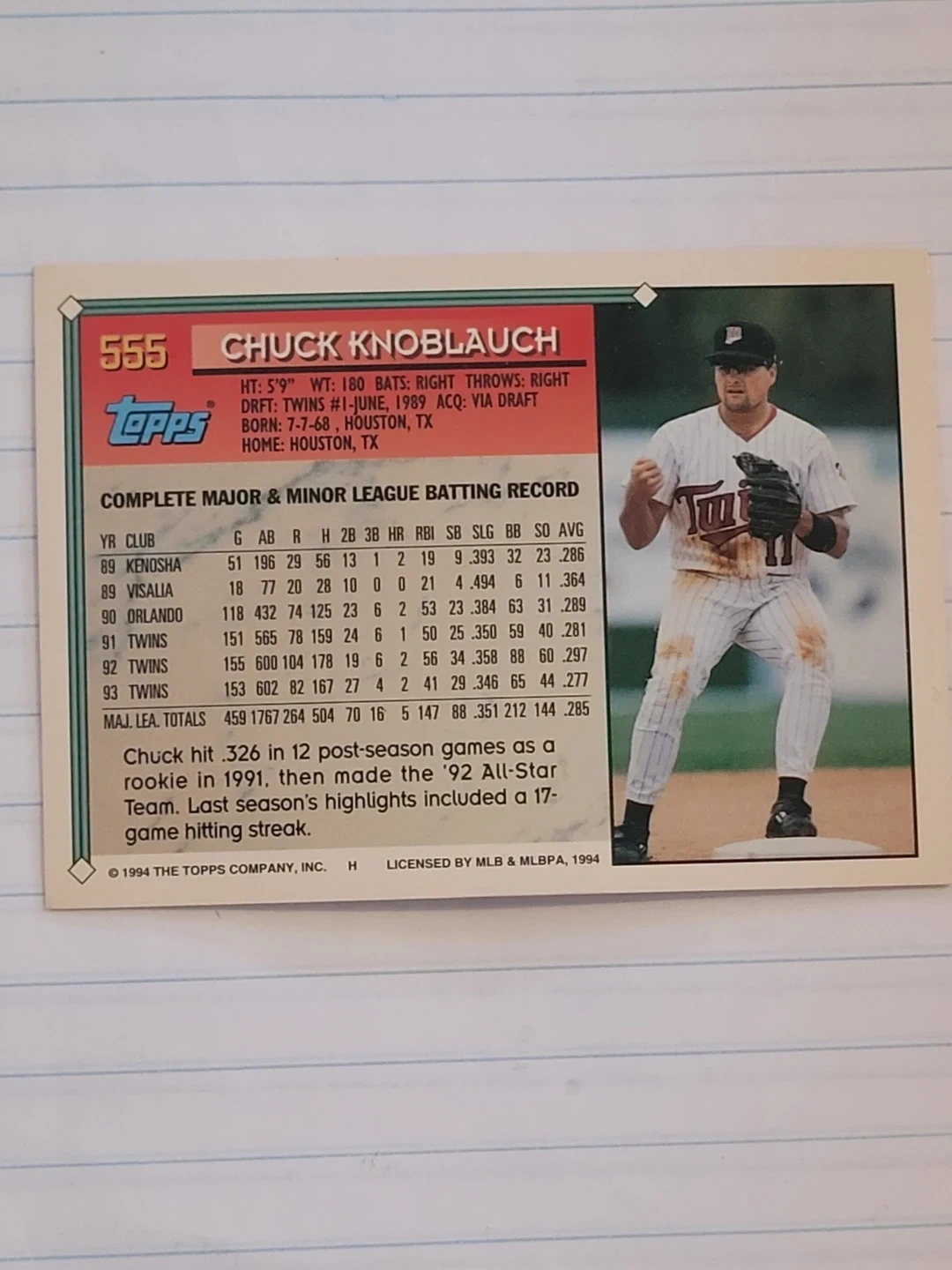 1994 Topps baseball card featuring Chuck Knoblauch of the Minnesota Twins. His career stats are included on the back. This card highlights his playing record from 1989 to 1993.